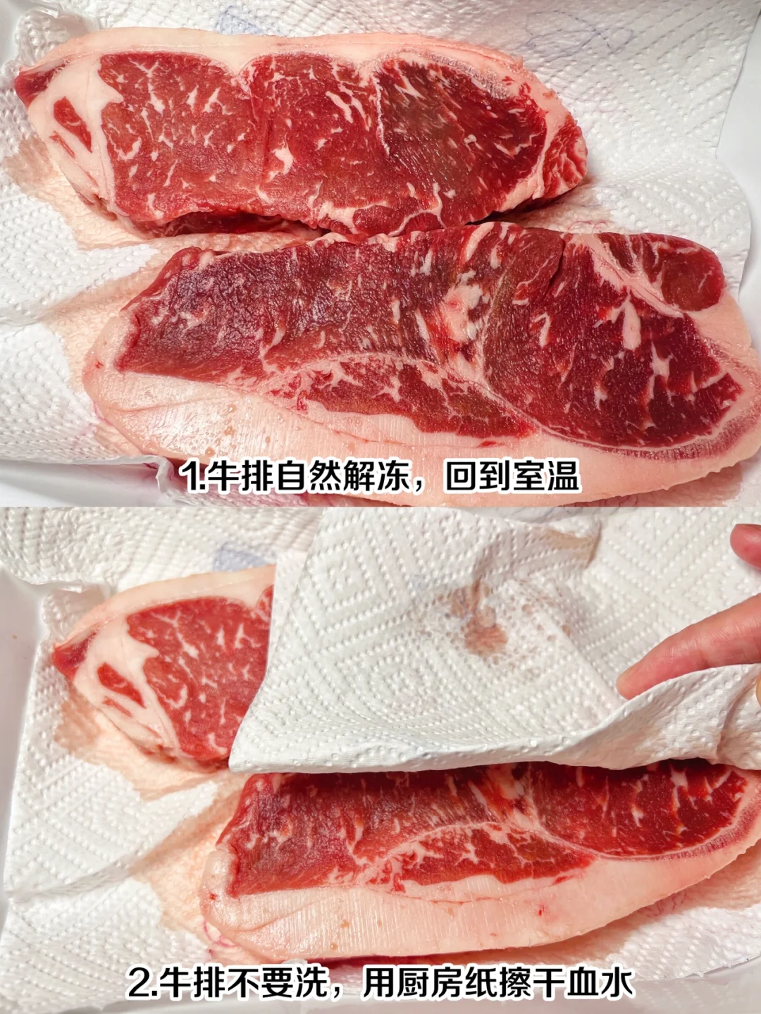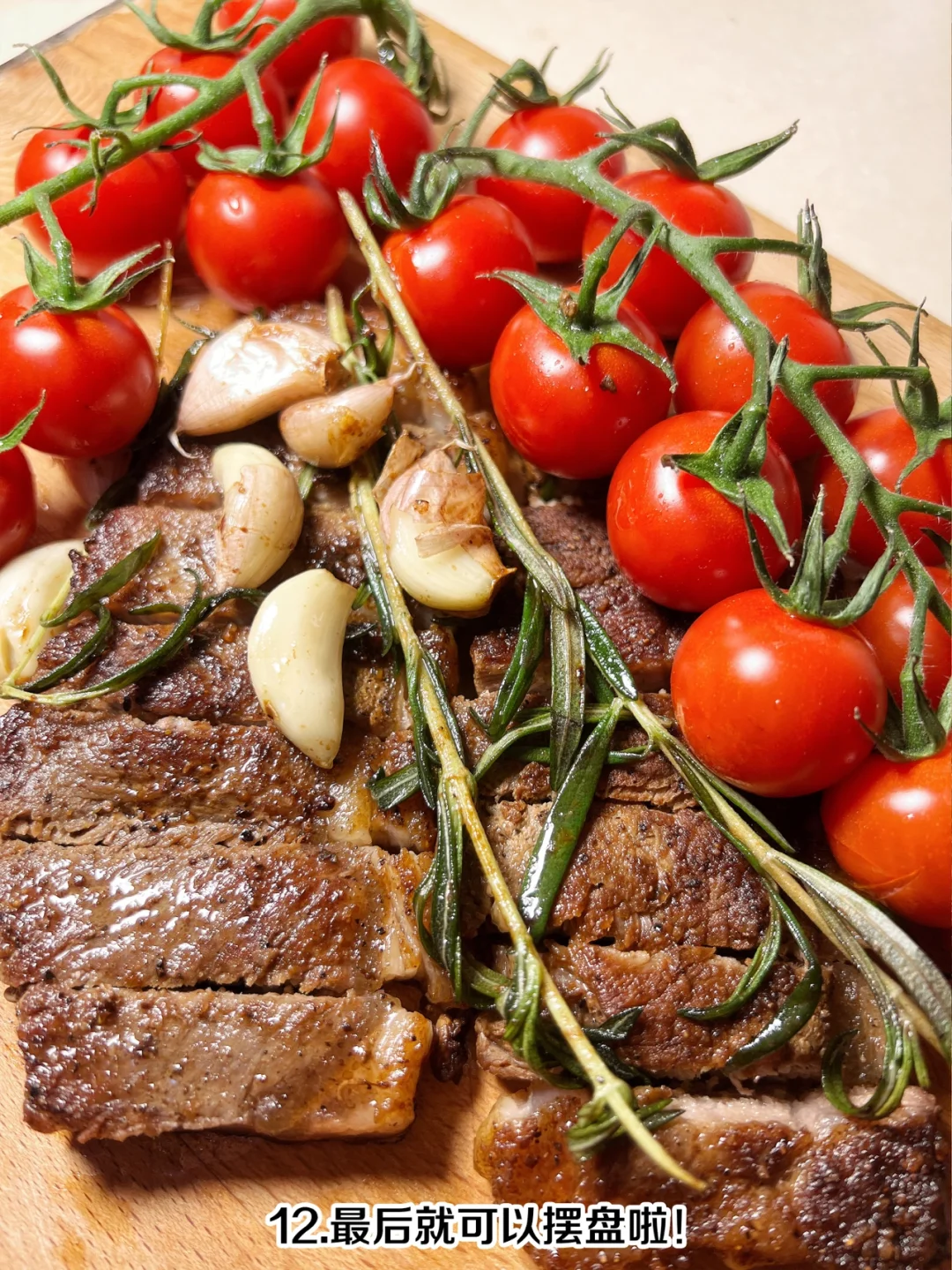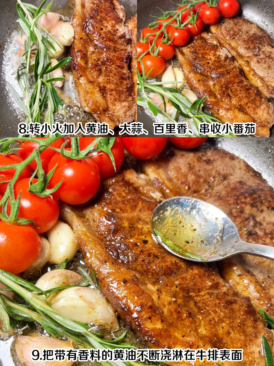步骤🌟 1、牛排自然解冻,回到室温 2、牛排不要洗,用厨房纸擦干血水 3、撒上玫瑰盐和黑胡椒,每一面都要沾到 4、在表面抹一层食用油 5、大火热锅,直接下牛排 6、一面出现焦化的脆壳再去翻面 7、侧面两边也要封一下 8、转小火加入黄油、大蒜、百里香、串收小番茄 9、把带有香料的黄油不断浇淋在牛排表面 10、牛排取出醒肉,盖上锡纸保温 11、可以切肉了 12、最后就可以摆盘啦✌️[色色R]