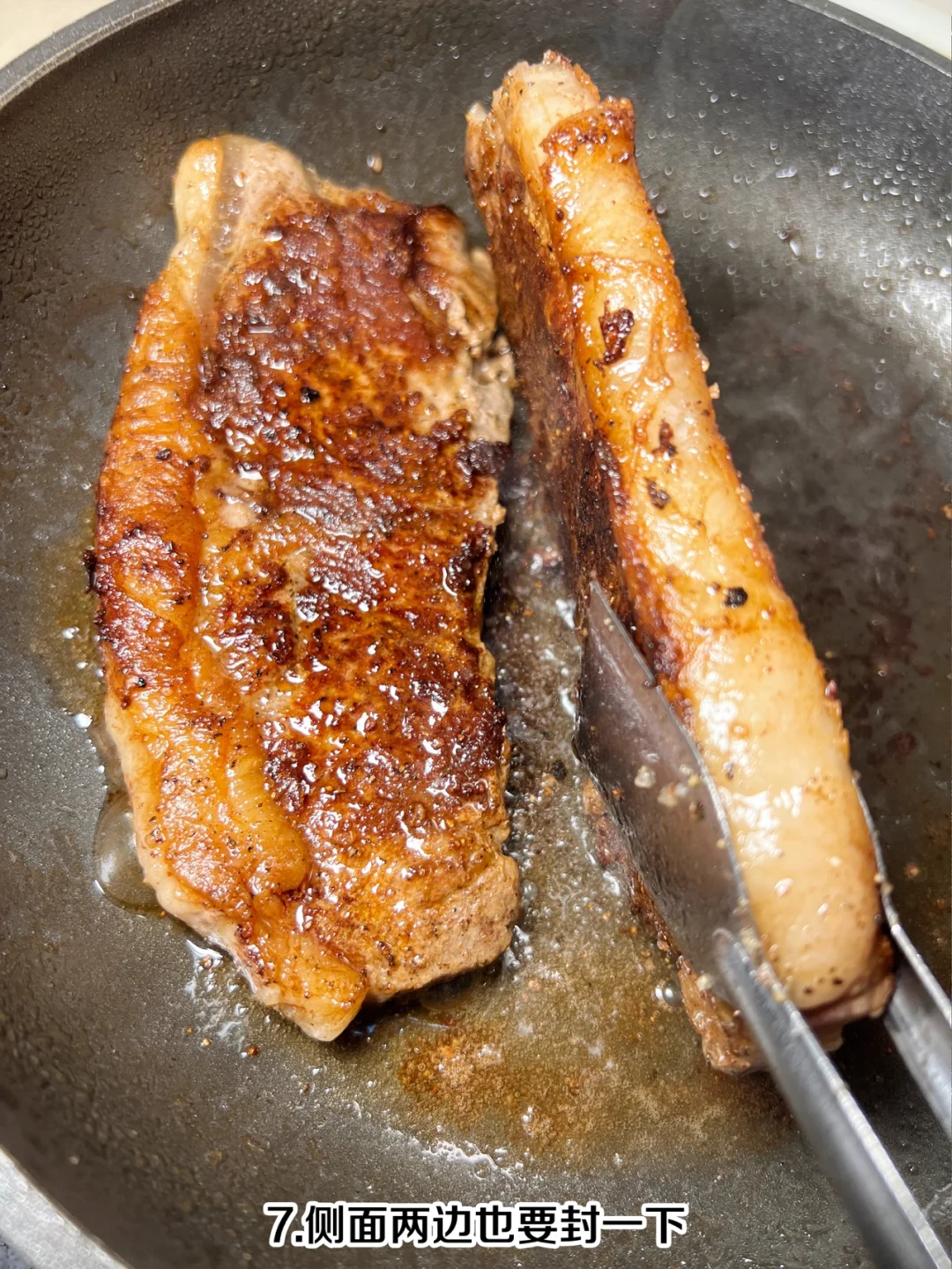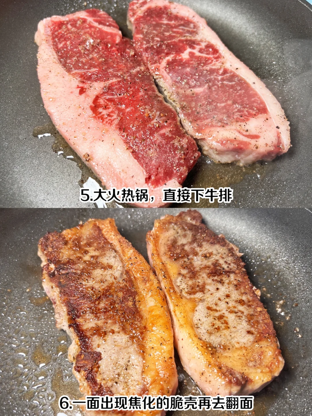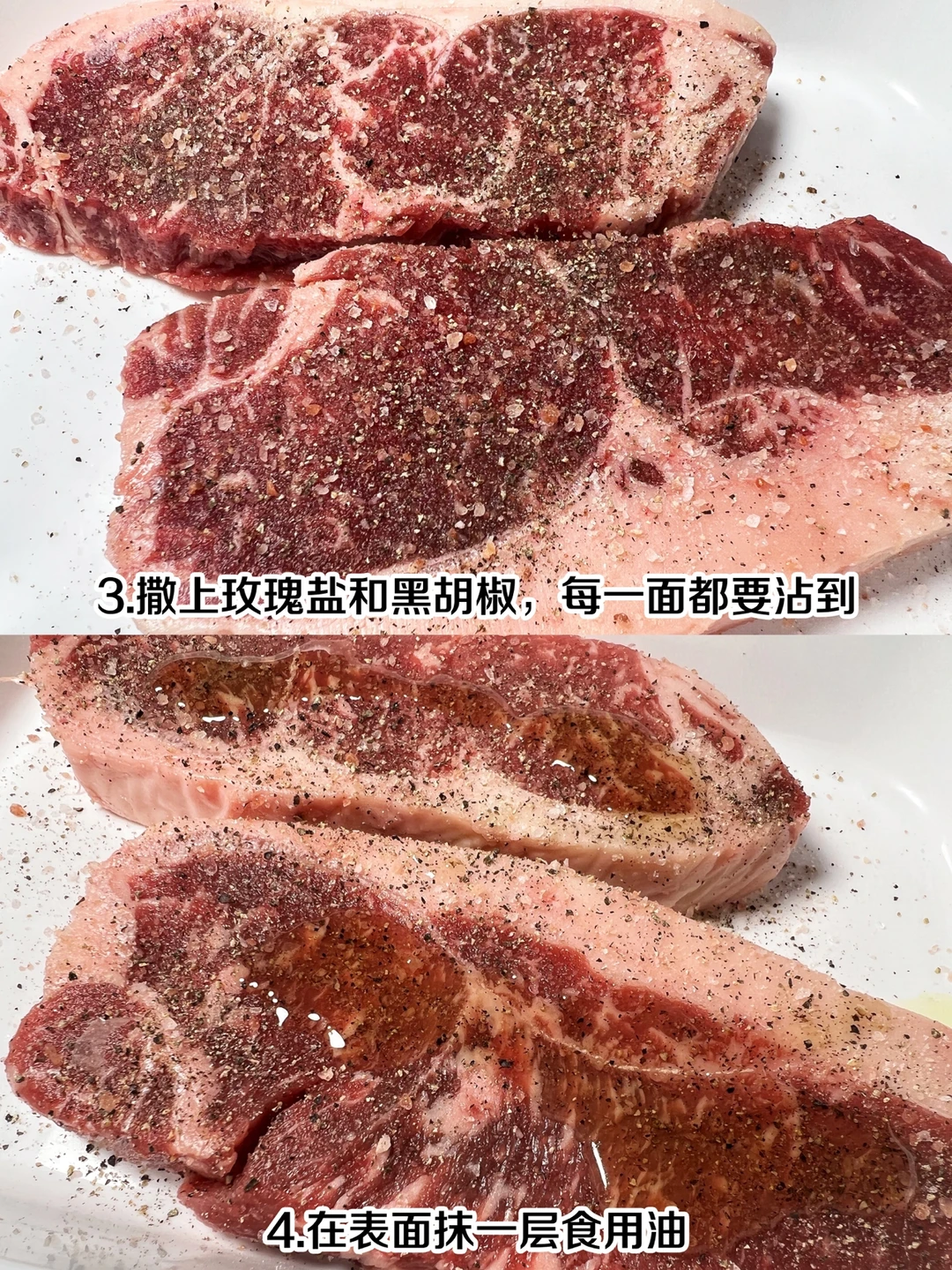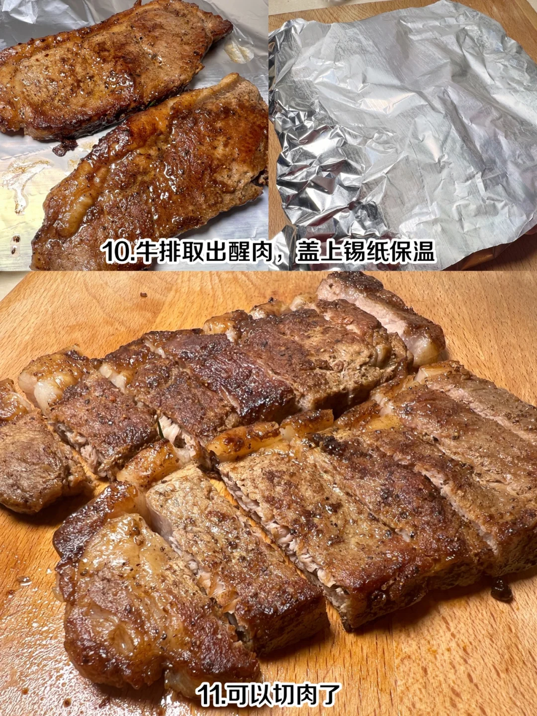 步骤🌟 1、牛排自然解冻,回到室温 2、牛排不要洗,用厨房纸擦干血水 3、撒上玫瑰盐和黑胡椒,每一面都要沾到 4、在表面抹一层食用油 5、大火热锅,直接下牛排 6、一面出现焦化的脆壳再去翻面 7、侧面两边也要封一下 8、转小火加入黄油、大蒜、百里香、串收小番茄 9、把带有香料的黄油不断浇淋在牛排表面 10、牛排取出醒肉,盖上锡纸保温 11、可以切肉了 12、最后就可以摆盘啦✌️[色色R]