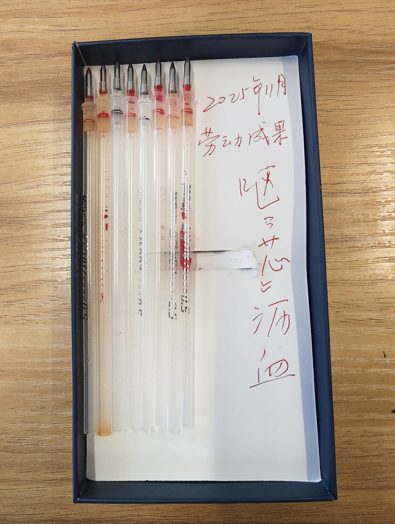 今天把11月份用完的红色中性笔芯集中起来,一共六根,平均一周用一根多。我打算把这件事情继续做下去,直到退休。我距离退休还有大约10年时间,按照这个速度,大约可以积攒六百根左右。退休那天,我打算将这六百根红笔芯做成一件装置作品,留在校史馆里,纪念自己40年平凡而辛苦的教师生涯。