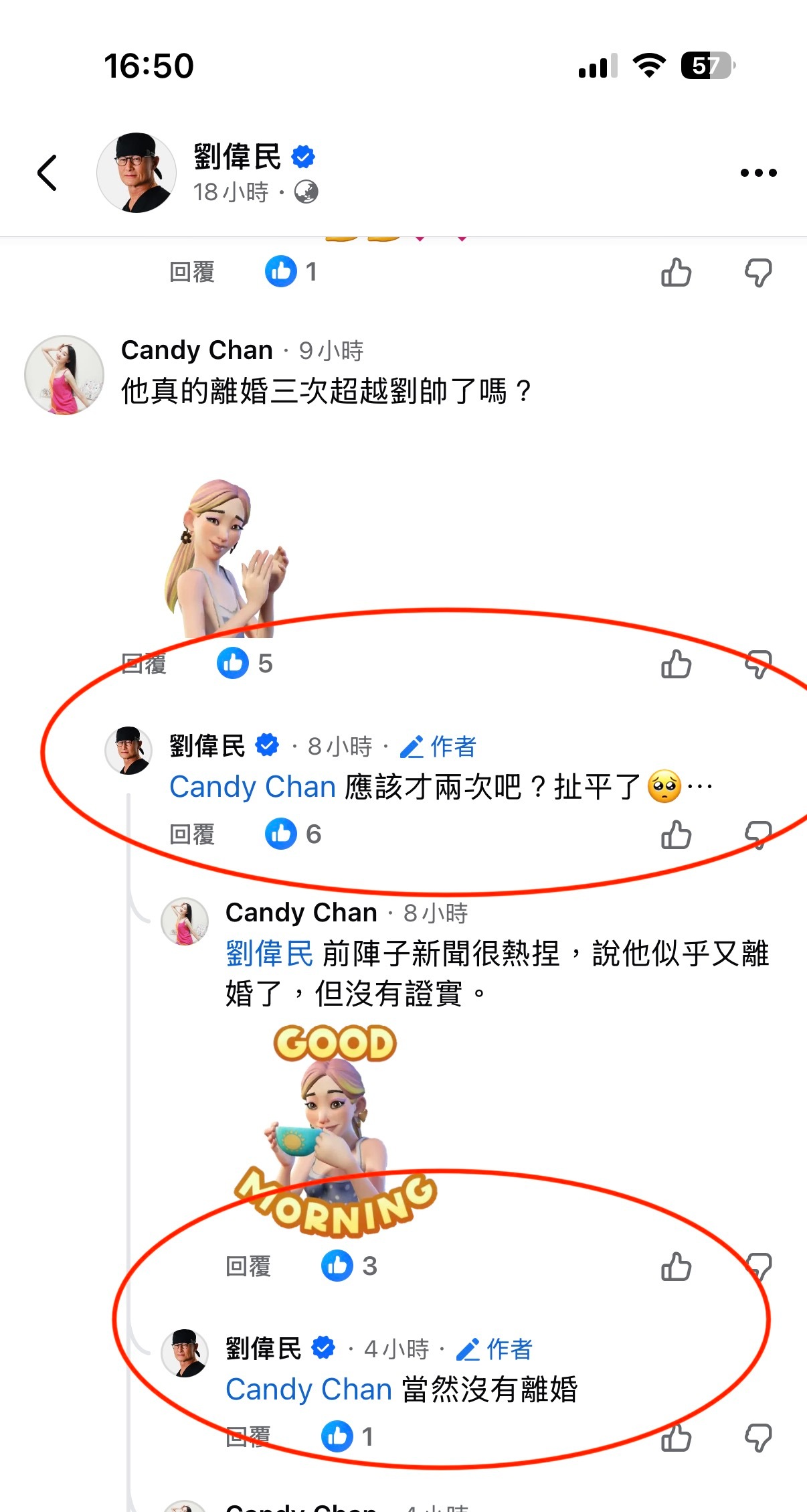赖弘国恩师帮其澄清离婚传闻:「当然没有离婚」!日前妇科名医刘伟民晒出和赖弘国合照,发文写下:「其实真的没什么大事,可能经历了和我当初同样的处境……。」对于网友留言好奇赖弘国是否真的又离婚了,对此刘伟民回「应该才两次吧」、「当然没有离婚」据新闻刘伟民本身亦有两段婚姻经历,第一段因自己外遇告终,第二段则因小22岁妻子出轨画下句点。