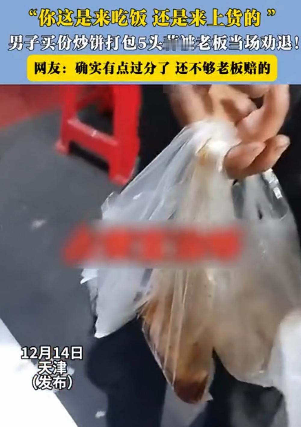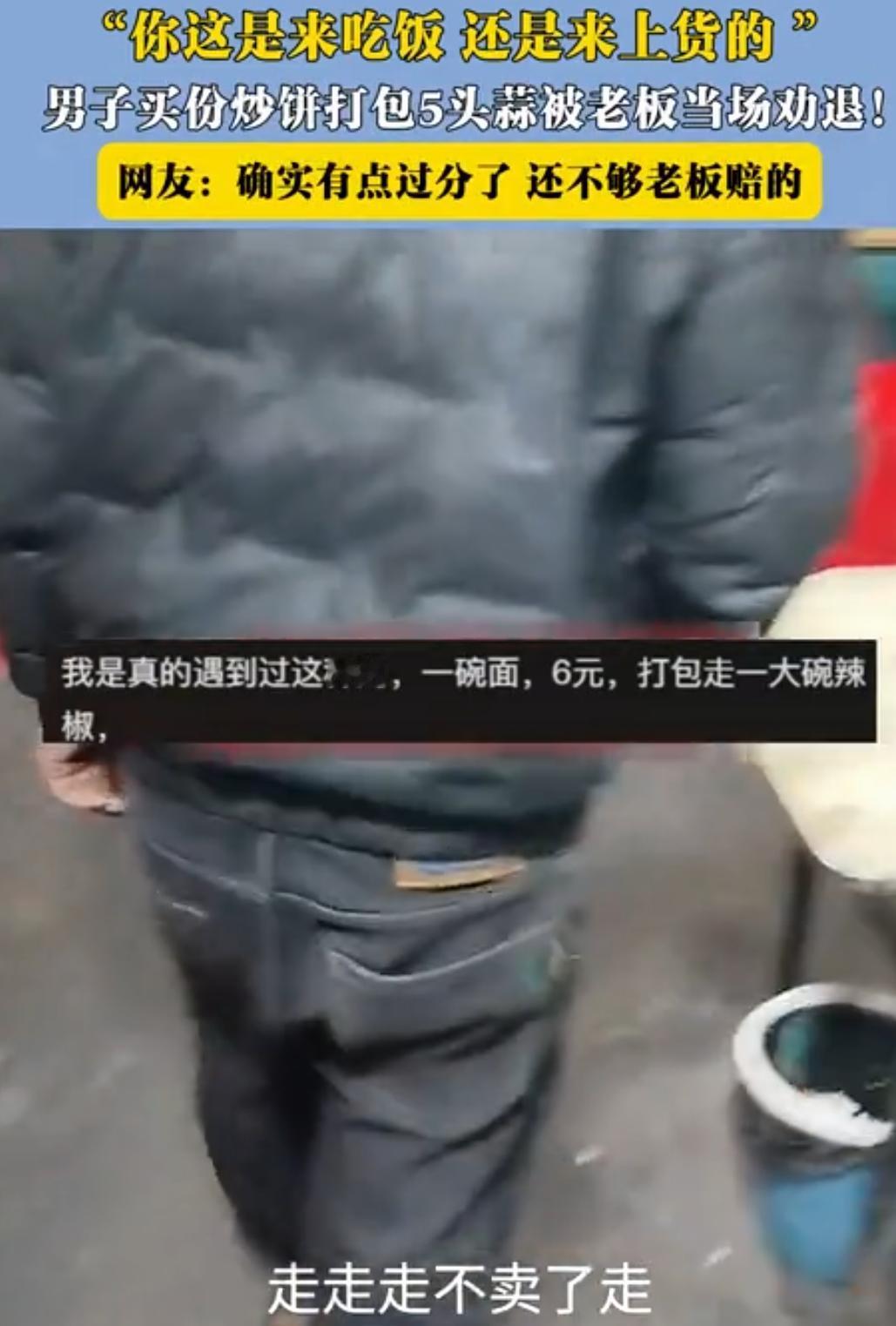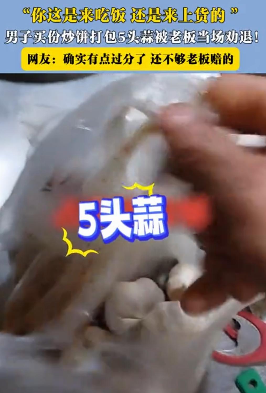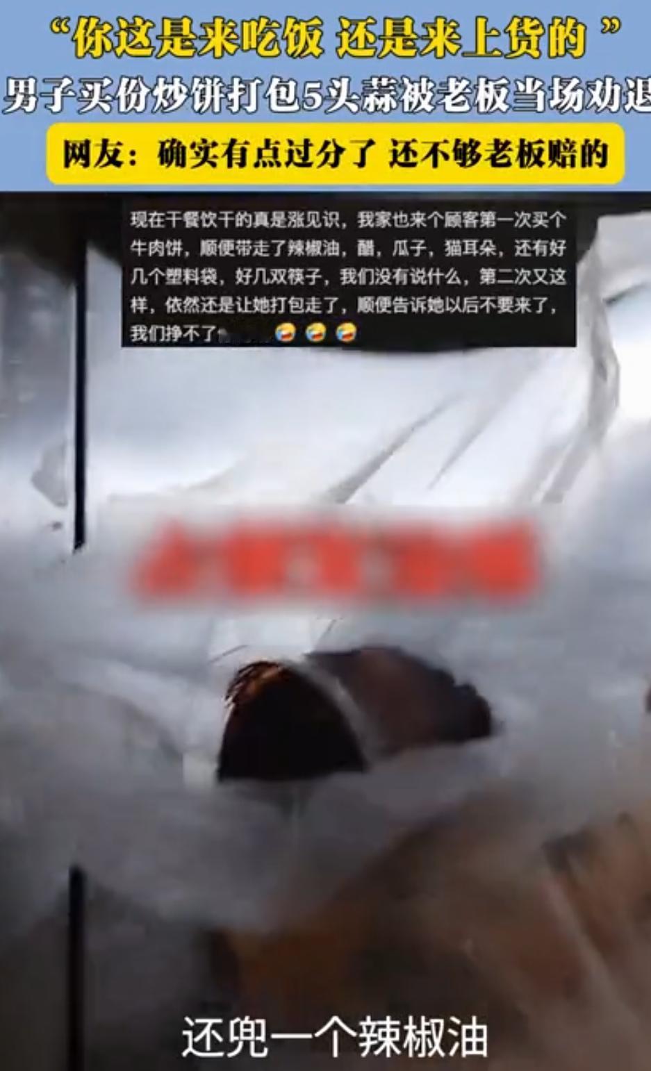 这羊毛薅的有点过份了! 天津一小伙到店打包一份炒饼,价格6块钱,吃炒饼搭配大蒜、咸菜和辣椒油,无可厚非。 可店老板见小伙用三个袋子提着配菜,让他放下打开一看,好家伙,辣椒油和咸菜就不说了,竟然还有5头蒜。 老板一下不乐意了,这是来买吃的吗,分明是来进货的,最后,东西不卖给小伙子,把人推出了店。 都知道,饭店配菜是给就餐客人准备的,在店里吃可以,但带走不行,打包可以,按适量的比例来拿。 对此,网友议论纷纷: 有的说:“老板没格局,生意做不大。” 有的说:“就该治治这样的人,吃相太难看,薅羊毛脸皮还一个比一个厚。” 小本生意,粗略算一下,5头蒜菜市场买差不多要卖6元左右,主食才6元,还不算其它配菜,老板卖一份饭还要倒贴。 5头蒜别说一顿,三顿五顿也吃不了,小本买卖经不起这样连吃带拿,要是客人都这样,那还开什么店。 大家有没有发现,现在的快餐、外卖、食堂的菜里都不放蒜了,因为当前的蒜头价格贵。 贪图小便宜吃大亏的例子有哪些 大蒜行情