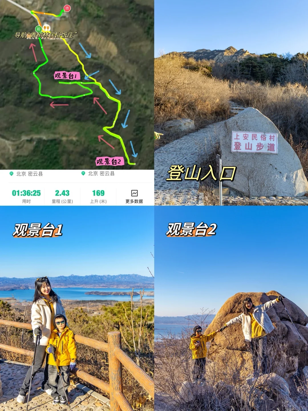 ʜ̆̈ᴇ̆̈ʟ̆̈ʟ̆̈ᴏ̆̈大家好🎀 这里是爱户外、爱遛娃的杨小兔儿🐰 . 冬季带娃户外不能停🔥 密云水库已逐渐上冰🧊 分享一条免费无人的小众徒步路线‼️ 老规矩👉🏻攻略已经整理好啦‼️直接拿走抄作业✏️ . 🌟推荐理由🌟 ✔️登高望密云水库超壮观 ✔️台阶路0难度,适合低幼 ✔️2条路线2个观景台,观景视野好 ✔️免费无人,超小众 . 🌈上安村步道 📍密云区上安村内 🧭导航“青树林民宿饭庄”,这里是登山的入口,免费停车,无门票,有充电桩 🗺️地图画好了在【图2】,需要六只脚路线可以💌我 . 🟠路线1️⃣:懒人路线 从坡道顺时针上山,看到“上安民俗村登山步道的牌子”走700米,不到10分钟,就可以抵达第一个观景台,俯瞰密云水库,【首图】视角。如果只想观景,不想多走,那么就可以往返了。 . 🔴路线2️⃣:轻徒步路线 抵达第一个观景台后继续上山,大概40分钟可抵达第二个观景台,这里高度更好,视野更广。返回后可走环线下山不走回头路。边玩边走总共耗时1.5小时,2.5km。 . ⛰️周边玩法⛰️ 🔸附近上安村有童话树屋的民宿,可2天1晚过周末(主页有攻略笔记) 🔸美食可以去附近的揽湖山庄体验铁锅炖鱼,味道还不错 🔸密云水库有好几个观湖点,1日游可以顺道去水库大坝看看 . ⚠️温馨提示⚠️ ▫️整条徒步路线都可以看到密云水库,不管顺时针走还是逆时针走都别忘了回头看看,真的好震撼 ▫️沿路有路牌,指示清晰 ▫️建议上午或下午早点去,晚点阳光会被遮住,拍照全是阴影不好看 . 有任何问题欢迎留言📝 祝大家玩儿的开心呀❤️ . 我是杨小兔儿🐰 五代土生土长的北京大妞儿🎀 爱旅行、爱分享、擅长做实用攻略✏ 更多宝藏旅行好去处🌲欢迎去主页看看🏷 —