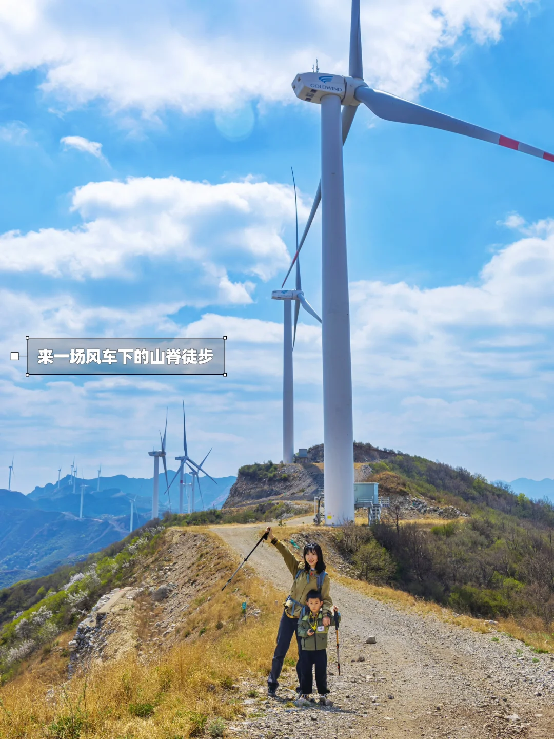 🌟在水库延岔路左侧上山,再走2.8km途径水源头,达到山顶,可以看到巨大的发电风车和北京-河北界碑,沿途有凉亭、小溪、山桃花