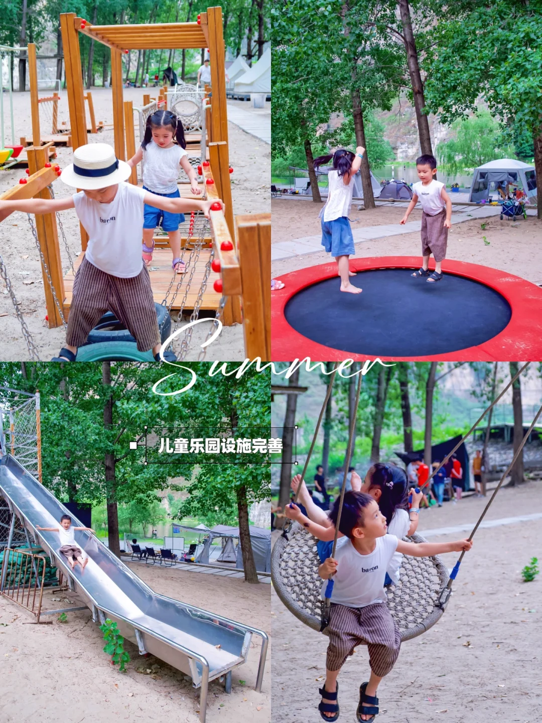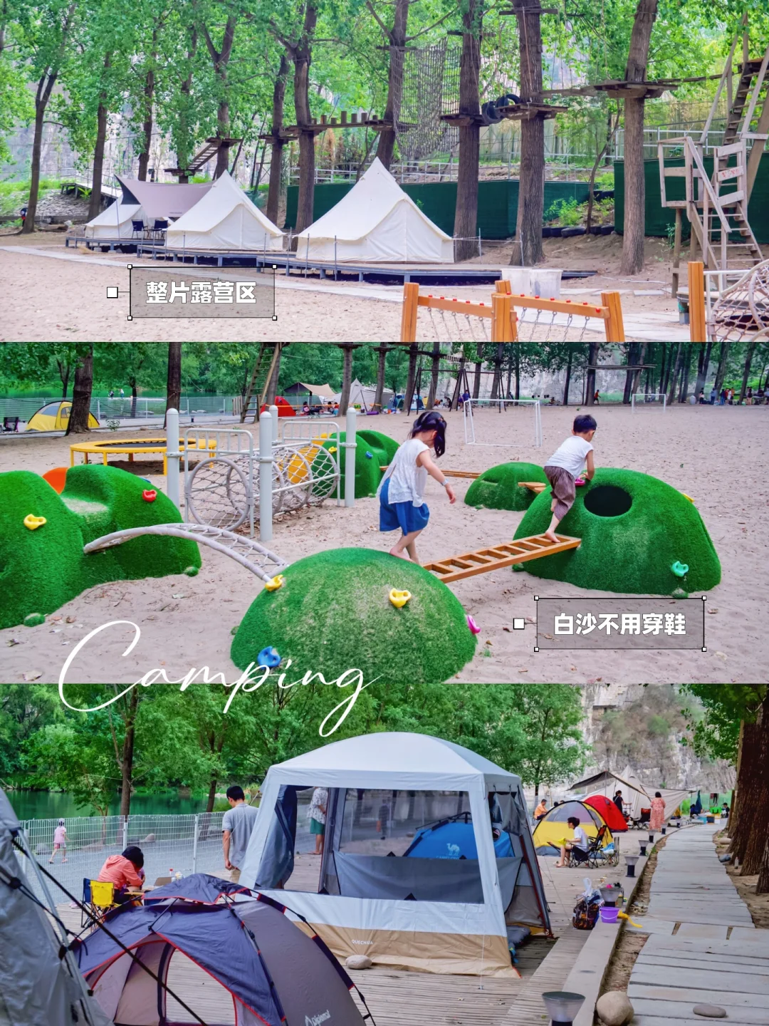 有秋千、攀岩、滑梯、攀爬架、蹦床等儿童设施,脚下是沙池,可以光脚玩儿。树上有儿童拓展区,离露营区很近,实现躺着遛娃
