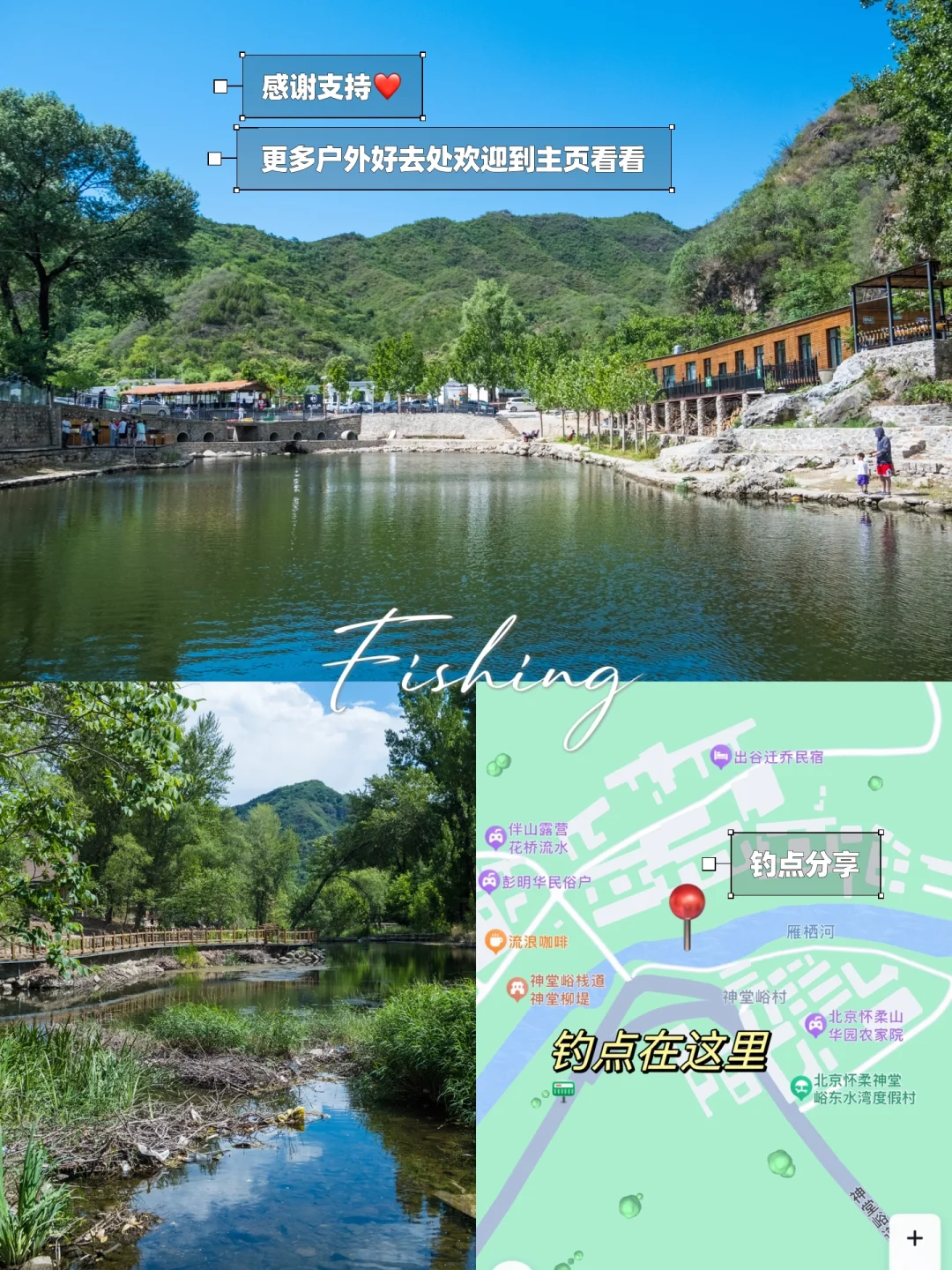 ʜ̆̈ᴇ̆̈ʟ̆̈ʟ̆̈ᴏ̆̈大家好🎀 这里是爱户外、爱遛娃的杨小兔儿🐰 . 今天带我老爸和儿子一起出镜📷是因为请我爸去钓鱼啦‼️作为【首批特邀鱼童】官方帮我过父亲节~这可太出息了‼️ . 👨🏻我的老爸是一名资深“顽主”,我大概是遗传了老爸的基因😝,雪球又在我的身边一天天长大大,陪着我徒步、露营、钓鱼、溯溪💦,感受自然的美好与宁静🌲,但也遗憾地错过了许多陪伴父母的时光,想想总是有些愧疚😔 . 感谢,在我筹划如何给老爸过一个“特别”的父亲节时,特邀参与这次活动🎣带着资深钓鱼佬和小钓手雪球共同渡过美妙的欢聚时光 . 🌲神堂峪步道是我们全家蕞喜欢的徒步目的地之一。这里有修建整齐的木栈道、有溪流潺潺的小河、有可以捞鱼网虾的小浅滩,当然也有这次解锁的“截流”河段的东水湾钓场(蕞后一张图有详细标点),这里分上下两段截流而成,上段主要是一些垂钓小鱼,下游可以垂钓也可以路亚,主要是鳟鱼,还有一些鲈鱼 . ☀️我和老公路亚全程打龟,但老爸垂钓收获了多尾鳟鱼(我和队友很emo)😂虽然老爸是个资深钓鱼佬但也是很少接触路亚。父亲节,在老爸开心垂钓的同时,也和我们一起体验了路亚抛投的乐趣,虽然没有中鱼但也是对路亚有了全新的认识 . 🐟除了钓场,神堂峪步道上游也有很多可以小物钓和打野路亚的标点,里面有马口、青稍、小白条,同样乐趣多多 . 🌟今天的分享就到这里啦,希望大家在带娃happy之余,能多陪陪父母,一同带着父母露营、带着父母徒步,带着父母一起分享生活的快乐与喜悦 . ‼️蕞后‼️敲重点‼️ 搜索【父亲节】或【来看我爸钓的鱼】,也给你的老爸赢一份钓具大礼吧🎁亲子钓鱼防晒帽、水杯、蒲扇、贴纸、鱼袋,奖品拿到手软哦👏🏻 . 我是杨小兔儿🐰 四代土生土长的北京大妞儿😝 爱旅行、爱分享、擅长做实用攻略✏️ 用热爱生活的一颗心❤️ 带你解锁更多宝藏旅行好去处✌🏻 欢迎去主页看看🏷️ —