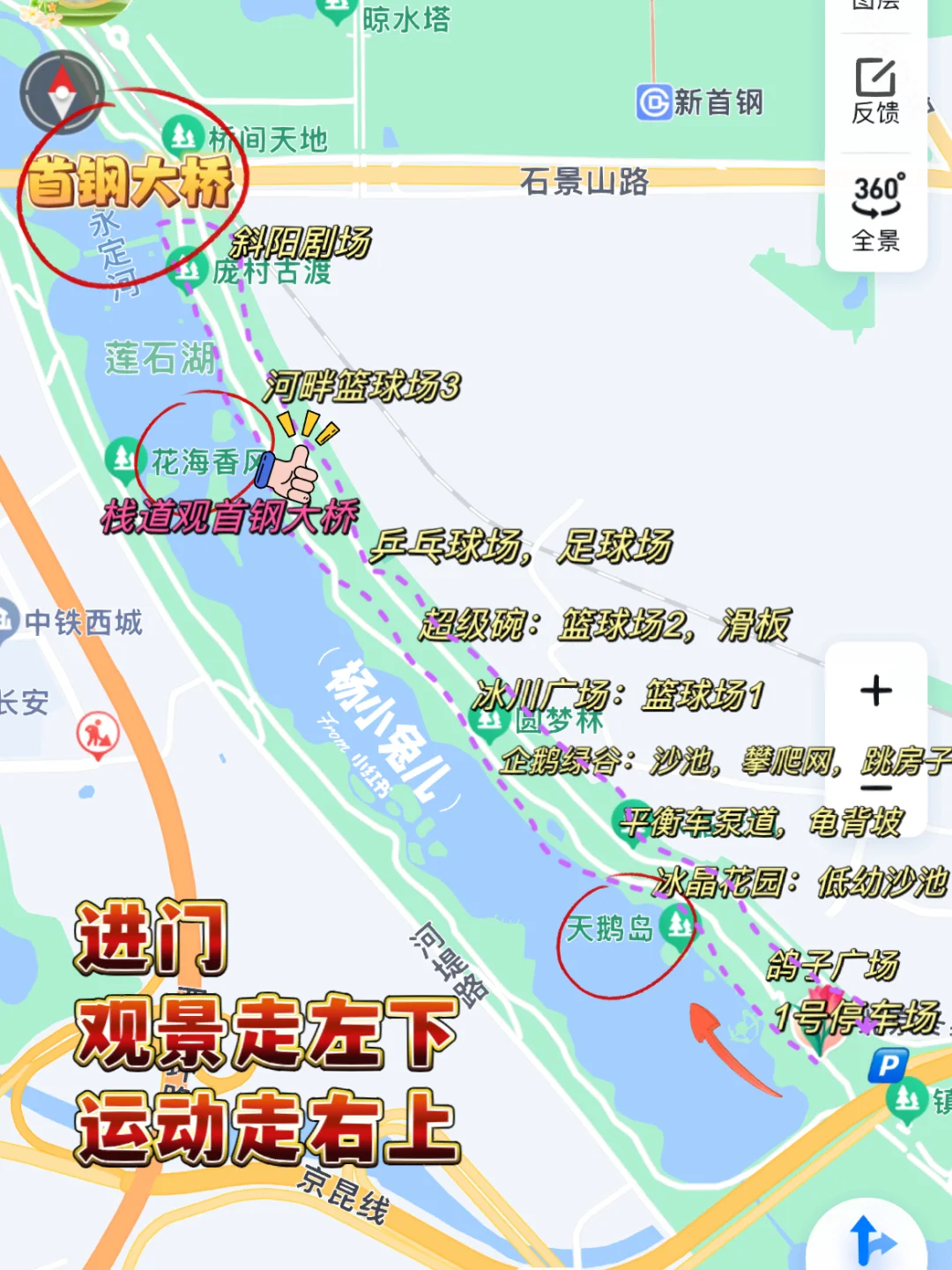 ʜ̆̈ᴇ̆̈ʟ̆̈ʟ̆̈ᴏ̆̈大家好🎀 这里是爱户外、爱遛娃的杨小兔儿🐰 . 市区里的免费宝藏公园‼️遛娃✅跑步✅陆冲✅露营✅各种运动场✅和儿童游乐设施✅全都是免费的‼️蓝天湖水映射下的首钢大桥美爆啦🔥收藏好这份地图~开心遛娃不迷路‼️ . 🌟推荐理由🌟 ✔️距离市区30分钟,交通方便 ✔️园区面积大,拒绝人挤人 ✔️设施齐全,成人孩子都有的玩儿 🉑露营、🉑徒步、🉑陆冲、🉑骑行 ✅儿童攀爬网✅白沙池✅泵道龟背坡 🏀篮球场⚽️足球场🏓乒乓球场 ‼️🆓关键是全部免费🆓‼️ . 🌈冬奥公园 📍石景山区园博大道附近 🧭用高D导航“冬奥公园1号停车场”,百D搜不到,停好车旁边就是入口 💡开放时间6:00-20:00 🆓门票免费 🅿️停车6元/小时,内有电瓶车可租 🎪建议游玩时长:半天 . 👉🏻冬奥公园有塑胶跑道和电瓶车道,全长8.8公里,体力好可以走完全程,园区也有熊猫电瓶车租🐼省体力 . ‼️园区设施区域详解‼️ 🧭具体路线可以参照手绘地图 🌈东线运动放电 ▫️鸽子广场:鸽子棚有数十只鸽子,可以喂食 ▫️冰晶花园:低幼区,有基础设施、沙池 ▫️泵道区:平衡车、自行车,有一圈泵道和几个龟背坡,家长有休息区 ▫️企鹅绿谷:沙池、攀爬网、大滑梯、跳房子 ▫️冰川广场:篮球场1、攀爬网 ▫️超级碗:篮球场2,可以玩滑板 ▫️运动区:足球场和乒乓球场 ▫️河畔篮球场3 ▫️斜阳剧场 🌈西线观景骑行 ▫️天鹅岛:有很多天鹅和鸭子 ▫️小瀑布观景 ▫️栈道观景 ⛺️公园里花丛树下都能露营,无固定区域,天幕帐篷均🉑 . 今天的免费编发和道具来自一家炒菜界的海底捞小放牛餐厅,这里不但可以免费编头发,还有各种各样的气球可以带走~拿着这束超美的玫瑰花,一路吸睛,拍的照片真的超好看哟 . 有任何问题欢迎留言📢 祝大家玩儿的开心哦✌🏻 . 我是杨小兔儿🐰 四代土生土长的北京大妞儿😝 爱旅行、爱分享、擅长做实用攻略✏ 用热爱生活的一颗心❤ 带你解锁更多宝藏旅行好去处✌🏻 欢迎去主页看看🏷 —