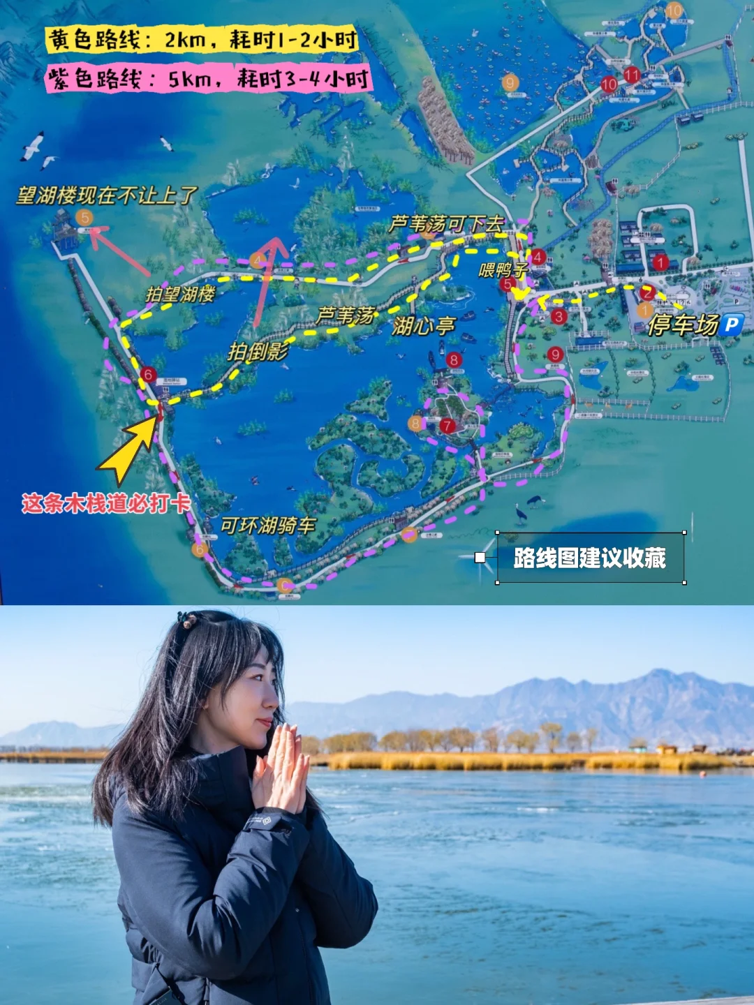 👣路线:进门右转走木栈,喂鸭子-拍芦苇荡-湖心岛-拍燕山水中倒影-走到头右转走环湖路-拍望湖楼-出大门