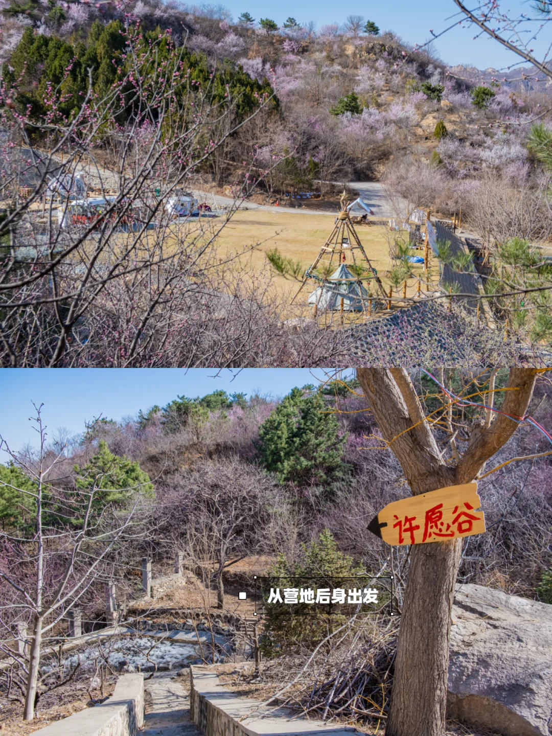 〰️停车后,在营地草坪下可以找到“许愿谷”的入口,按照布条一直走