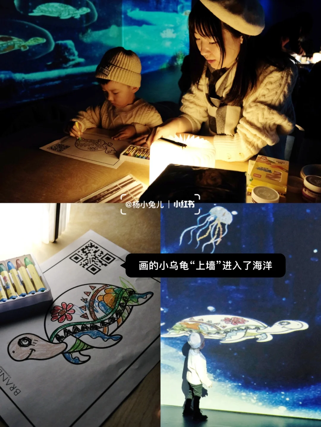 ✔️我和雪球蕞喜欢的就是“绘画上墙”,可以领一张特殊的画纸,用蜡笔涂上颜色,扫描之后就可以让小乌龟“活”起来🐢,你画的独1无2的小乌龟就进入了全息投影的整面海洋世界墙上,小朋友特别兴奋。