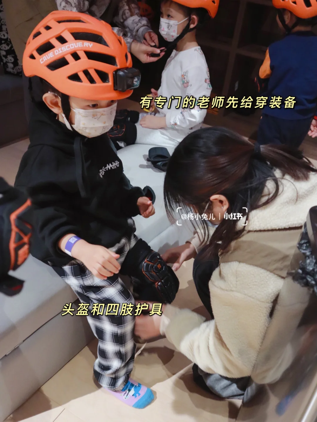 进门先换鞋子,需要自带防滑袜,如果现场买10元/双。然后佩戴头盔和护具,小朋友会有工作人员帮忙穿戴,都准备好就可以开始探险啦👏🏻