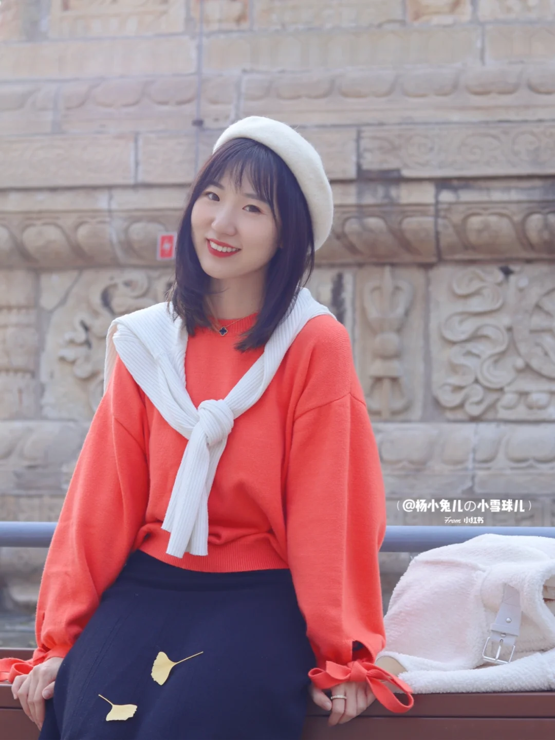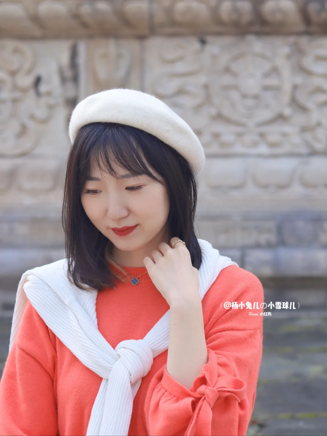 ▫️穿搭✌🏻穿着栗色米色橘色毛衣更有秋季的氛围,白色贝雷帽和白色披肩是点缀。