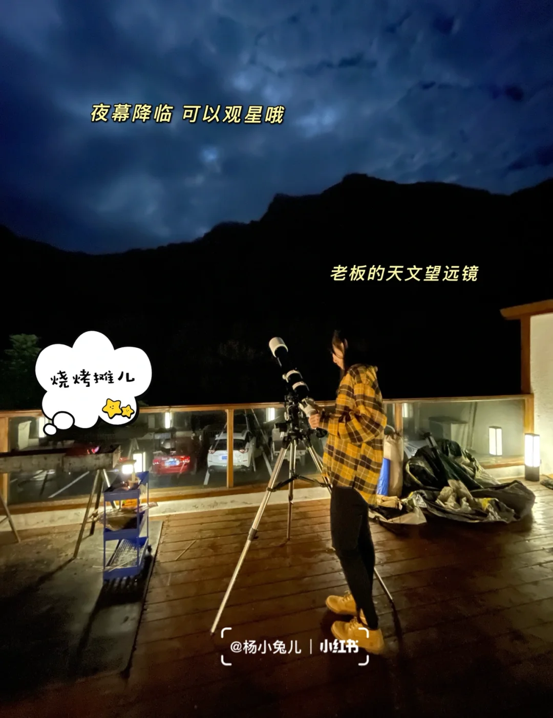 二楼的天台作用太大了,对面就是山和白河湾支流,景色宜人🏞。天台有餐桌可以烧烤火锅,旁边一片空地孩子可以搭帐篷玩儿⛺️。Zui重要的,老 板有一套天文望远镜,晚上可以任性的看月亮看星星啦⭐️