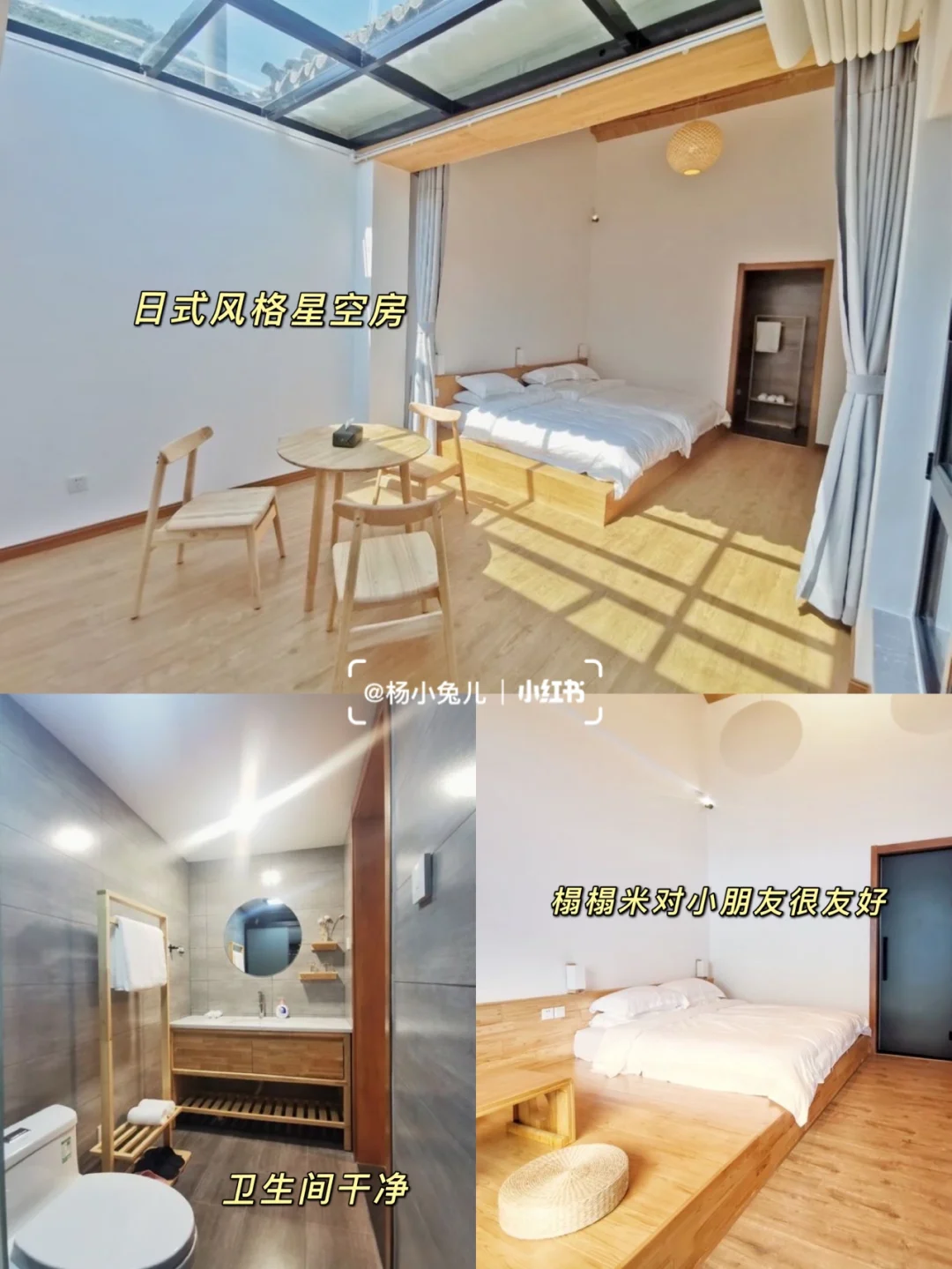 山水茗居主打日式风格精品民宿,一共有五间房,两间星空房是玻璃顶,全部是榻榻米风格的装修,可以坐着蒲 团一起喝茶🍵。院子不大,Si密性很强,适合找五家朋友一起包院,晚上想玩儿到几点自己说的算✌🏻