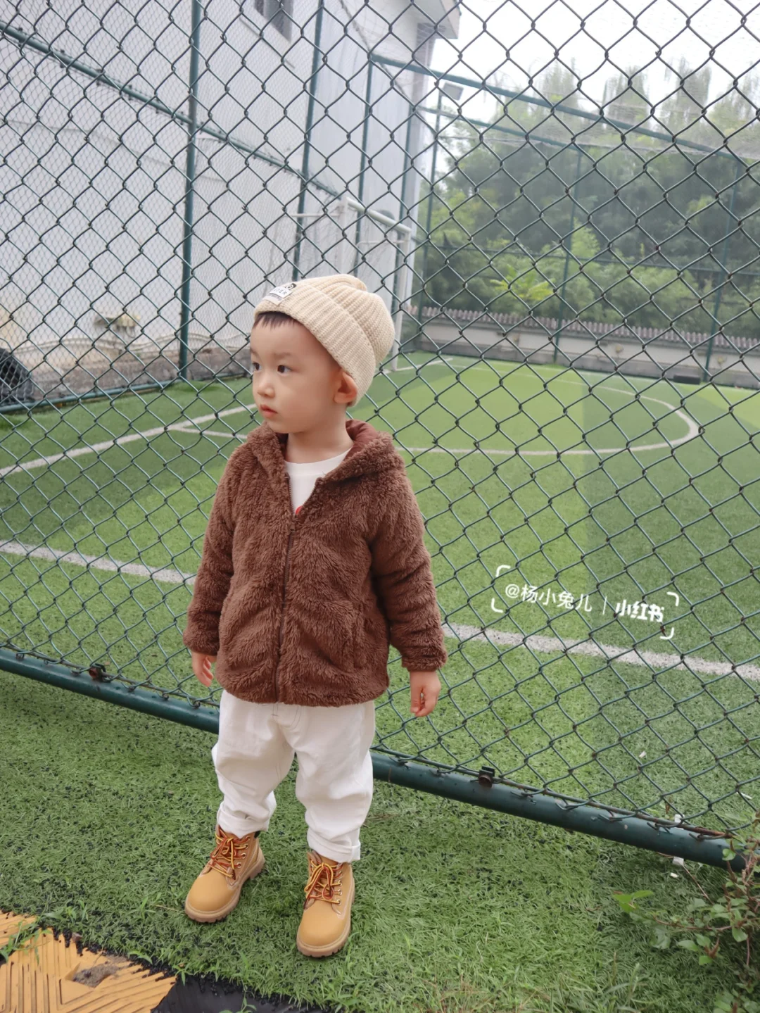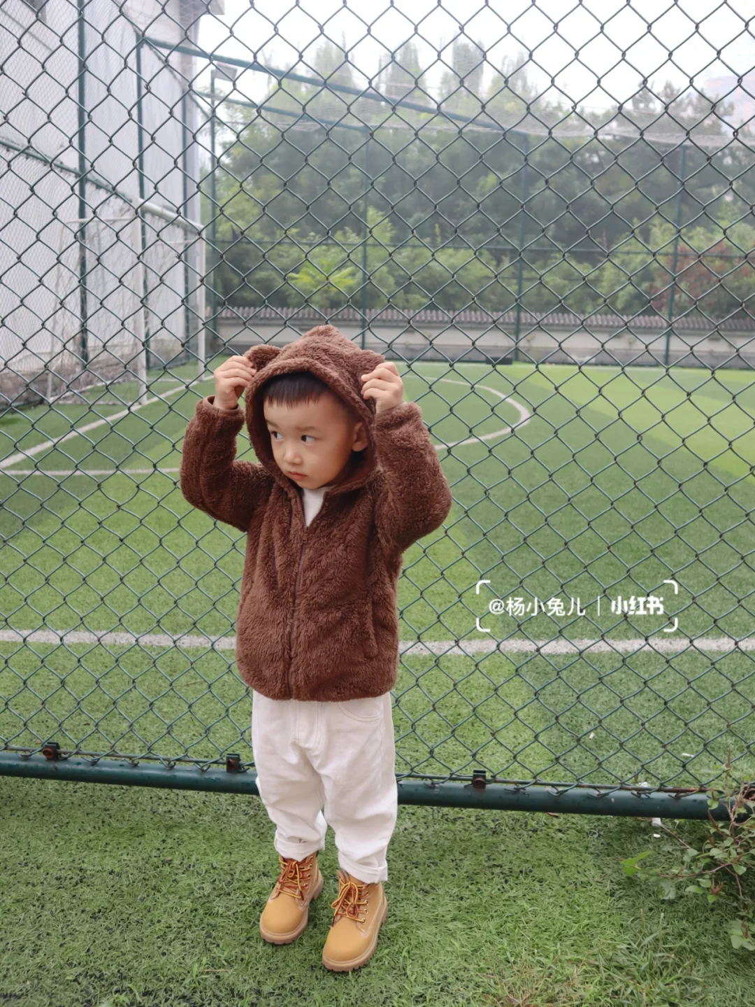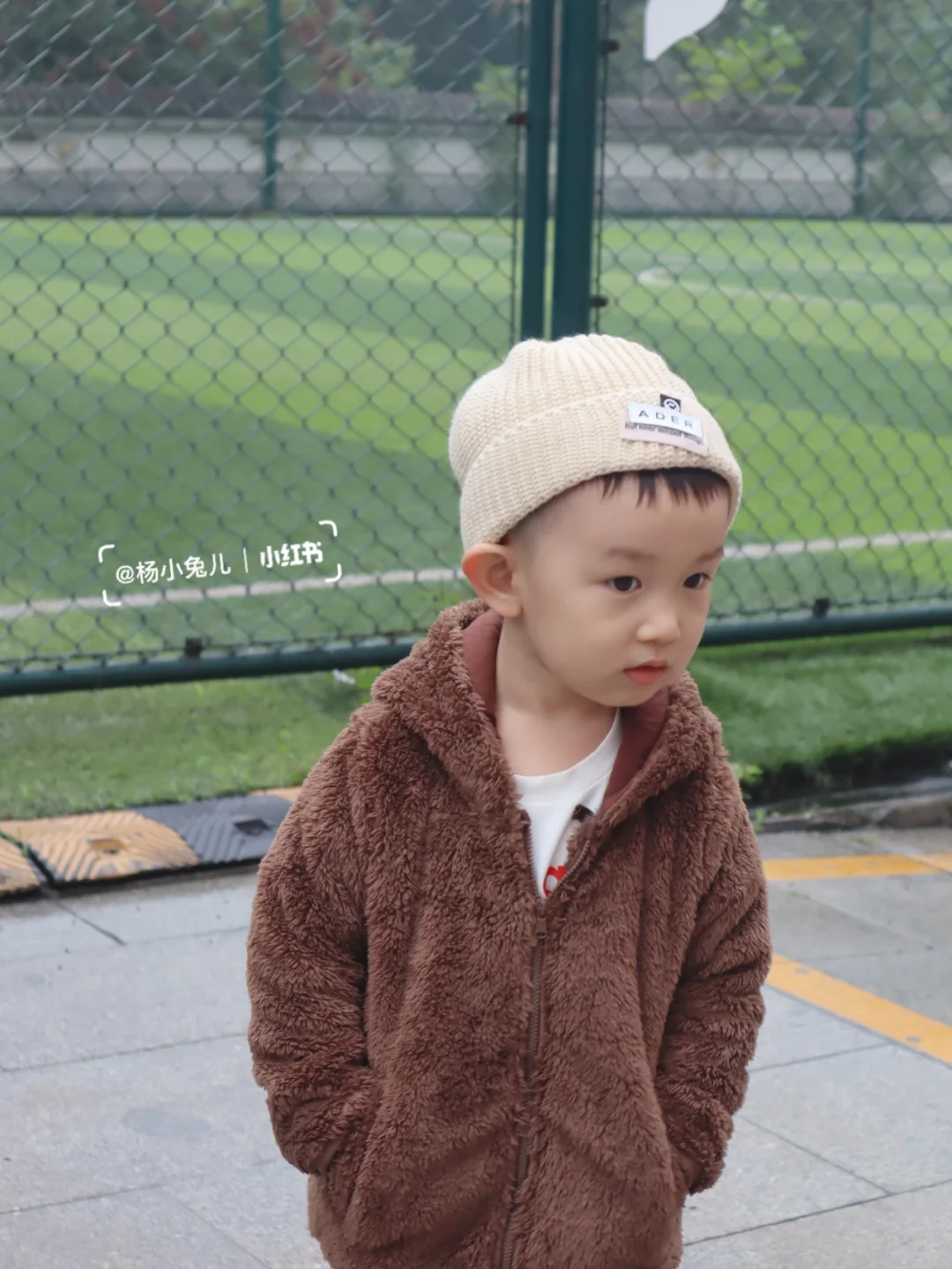 棕色摇粒绒外套瞬间变身可爱的小熊仔🧸,帽子上有两只耳朵,还可以立起来,萌翻啦❗️