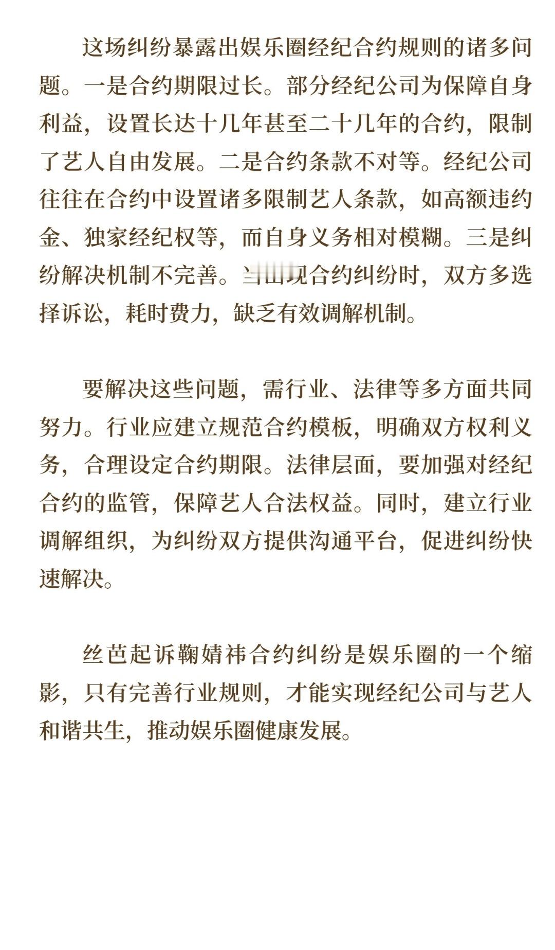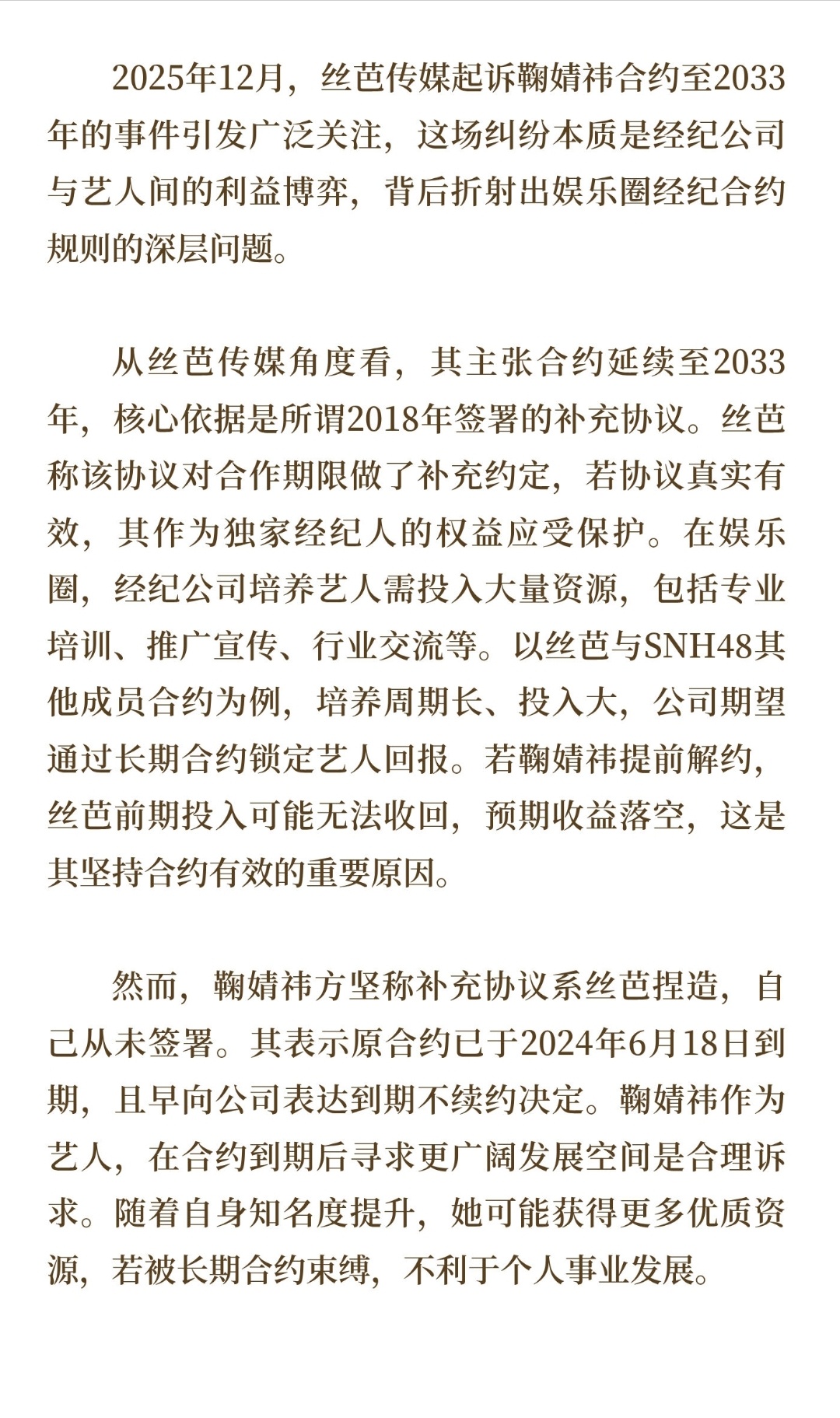 | 2025年12月,丝芭传媒起诉鞠婧祎合约至2033年的事件引发广泛关注,这场纠纷本质是经纪公司与艺人间的利益博弈,背后折射出娱乐圈经纪合约规则的问题。丝芭传媒主张合约延续至2033年,核心依据是所谓2018年签署的补充协议。丝芭称该协议对合作期限做了补充约定,若协议真实有效,其作为独家经纪人的权益应受保护。在娱乐圈,经纪公司培养艺人需投入大量资源,包括专业培训、推广宣传、行业交流等。以丝芭与SNH48其他成员合约为例,培养周期长、投入大,公司期望通过长期合约锁定艺人回报。若鞠婧祎提前解约,丝芭前期投入可能无法收回,预期收益落空,这是其坚持合约有效的重要原因。然而,鞠婧祎方坚称补充协议系丝芭捏造,自己从未签署。其表示原合约已于2024年6月18日到期,且早向公司表达到期不续约决定。鞠婧祎作为艺人,在合约到期后寻求更广阔发展空间是合理诉求。随着自身知名度提升,她可能获得更多优质资源,若被长期合约束缚,不利于个人事业发展。这场纠纷暴露出娱乐圈经纪合约规则问题。一是合约期限过长。部分经纪公司为保障自身利益,设置长达十几年甚至二十几年的合约,限制了艺人自由发展。二是合约条款不对等。经纪公司往往在合约中设置诸多限制艺人条款,如高额违约金、独家经纪权等,而自身义务相对模糊。三是纠纷解决机制不完善。当出现合约纠纷时,双方多选择诉讼,耗时费力,缺乏有效调解机制。要解决这些问题,需行业、法律等多方面共同努力。行业应建立规范合约模板,明确双方权利义务,合理设定合约期限。法律层面,要加强对经纪合约的监管,保障艺人合法权益。同时,建立行业调解组织,为纠纷双方提供沟通平台,促进纠纷快速解决。丝芭起诉鞠婧祎合约纠纷是娱乐圈的一个缩影,只有完善行业规则,才能实现经纪公司与艺人和谐共生,推动娱乐圈健康发展。