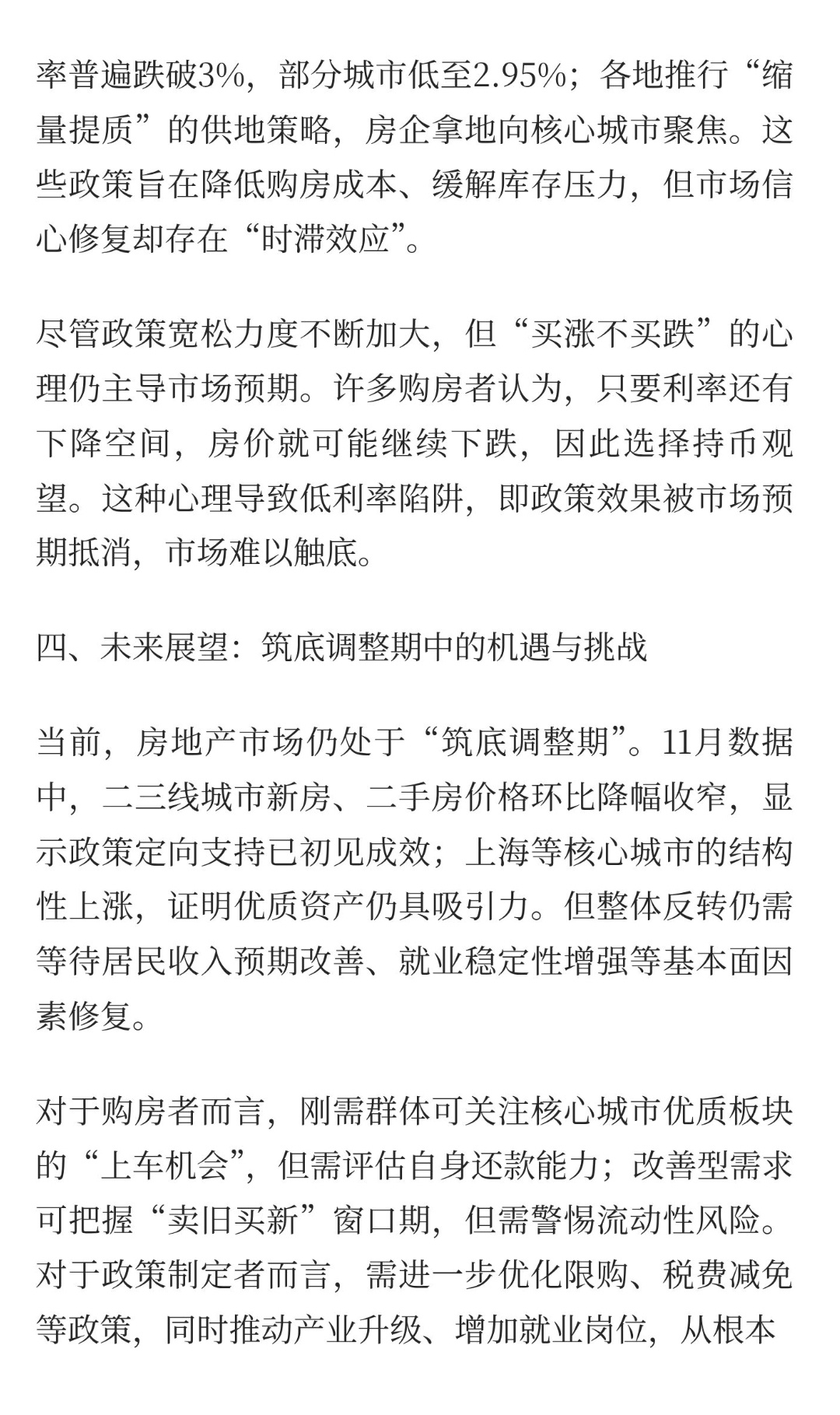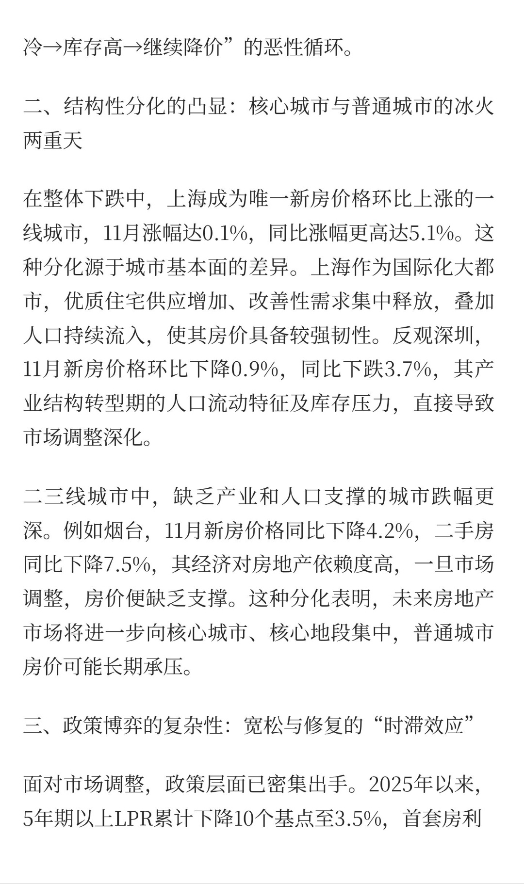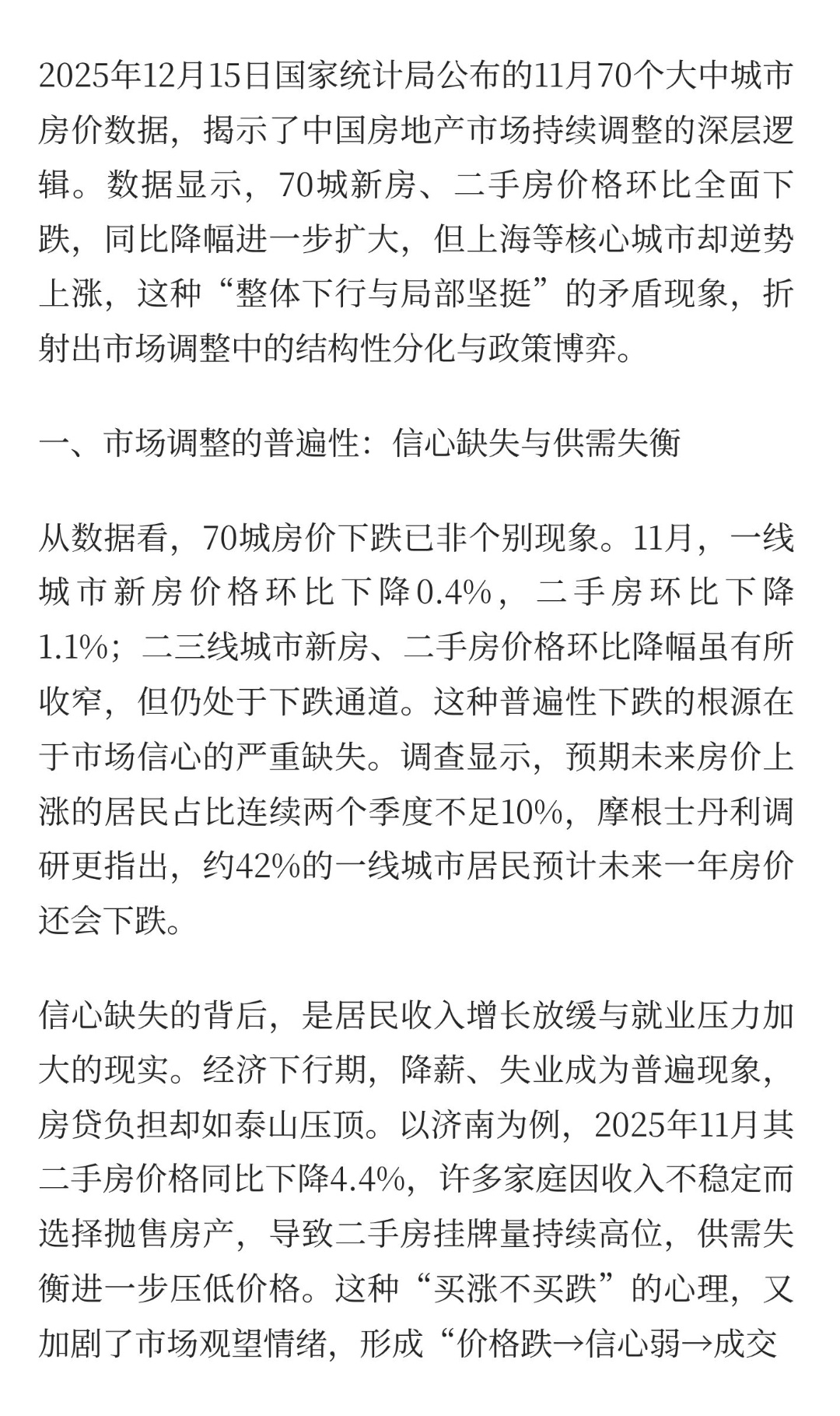| 2025年12月15日国家统计局公布的11月70个大中城市房价数据,揭示了中国房地产市场持续调整的深层逻辑。数据显示,70城新房、二手房价格环比全面下跌,同比降幅进一步扩大,但上海等核心城市却逆势上涨,这种“整体下行与局部坚挺”的矛盾现象,折射出市场调整中的结构性分化与政策博弈。11月,一线城市新房价格环比下降0.4%,二手房环比下降1.1%;二三线城市新房、二手房价格环比降幅虽有所收窄,但仍处于下跌通道。这种普遍性下跌的根源在于市场信心的严重缺失。调查显示,预期未来房价上涨的居民占比连续两个季度不足10%,摩根士丹利调研更指出,约42%的一线城市居民预计未来一年房价还会下跌。信心缺失的背后,是居民收入增长放缓与就业压力加大的现实。经济下行期,降薪、失业成为普遍现象,房贷负担却如泰山压顶。以济南为例,2025年11月其二手房价格同比下降4.4%,许多家庭因收入不稳定而选择抛售房产,导致二手房挂牌量持续高位,供需失衡进一步压低价格。这种“买涨不买跌”的心理,又加剧了市场观望情绪,形成“价格跌→信心弱→成交冷→库存高→继续降价”的恶性循环。在整体下跌中,上海成为唯一新房价格环比上涨的一线城市,11月涨幅达0.1%,同比涨幅更高达5.1%。这种分化源于城市基本面的差异。上海作为国际化大都市,优质住宅供应增加、改善性需求集中释放,叠加人口持续流入,使其房价具备较强韧性。反观深圳,11月新房价格环比下降0.9%,同比下跌3.7%,其产业结构转型期的人口流动特征及库存压力,直接导致市场调整深化。二三线城市中,缺乏产业和人口支撑的城市跌幅更深。例如烟台,11月新房价格同比下降4.2%,二手房同比下降7.5%,其经济对房地产依赖度高,一旦市场调整,房价便缺乏支撑。这种分化表明,未来房地产市场将进一步向核心城市、核心地段集中,普通城市房价可能长期承压。面对市场调整,政策层面已密集出手。2025年以来,5年期以上LPR累计下降10个基点至3.5%,首套房利率普遍跌破3%,部分城市低至2.95%;各地推行“缩量提质”的供地策略,房企拿地向核心城市聚焦。这些政策旨在降低购房成本、缓解库存压力,但市场信心修复却存在“时滞效应”。尽管政策宽松力度不断加大,但“买涨不买跌”的心理仍主导市场预期。许多购房者认为,只要利率还有下降空间,房价就可能继续下跌,因此选择持币观望。这种心理导致低利率陷阱,即政策效果被市场预期抵消,市场难以触底。当前,房地产市场仍处于“筑底调整期”。11月数据中,二三线城市新房、二手房价格环比降幅收窄,显示政策定向支持已初见成效;上海等核心城市的结构性上涨,证明优质资产仍具吸引力。但整体反转仍需等待居民收入预期改善、就业稳定性增强等基本面因素修复。对于购房者而言,刚需群体可关注核心城市优质板块的“上车机会”,但需评估自身还款能力;改善型需求可把握“卖旧买新”窗口期,但需警惕流动性风险。对于政策制定者而言,需进一步优化限购、税费减免等政策,同时推动产业升级、增加就业岗位,从根本上修复市场信心。房价下跌既是市场调整的必然结果,也是经济转型的阵痛体现。唯有正视结构性分化、破解政策博弈困局,才能推动房地产市场走向健康可持续发展。