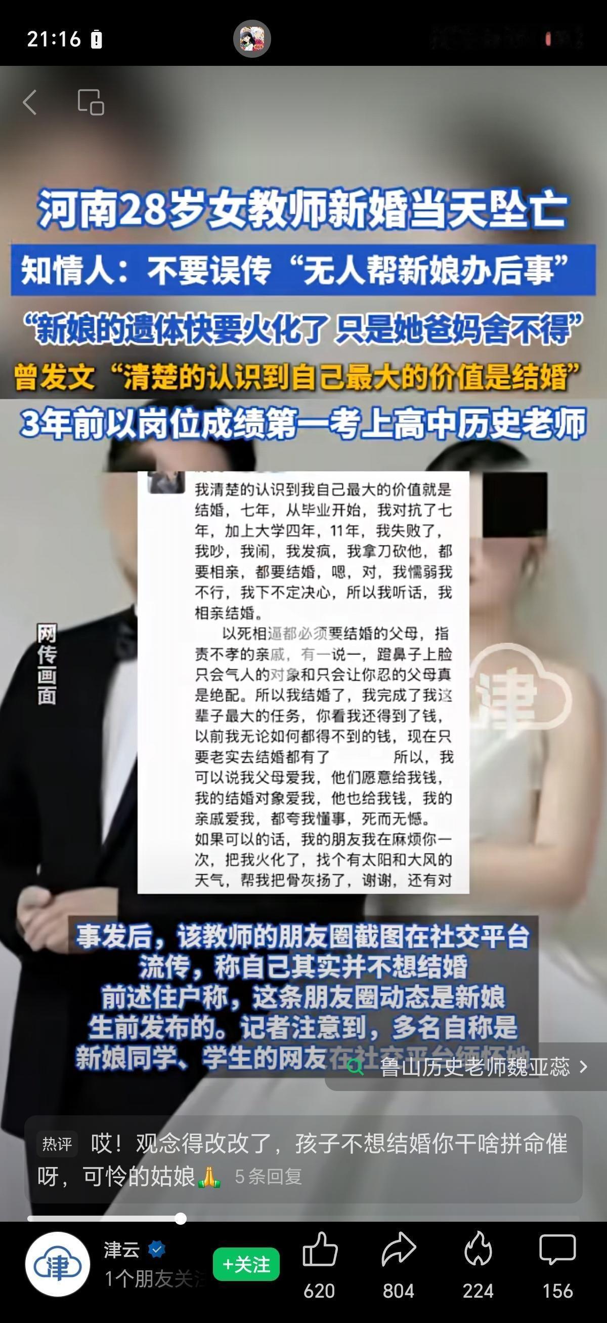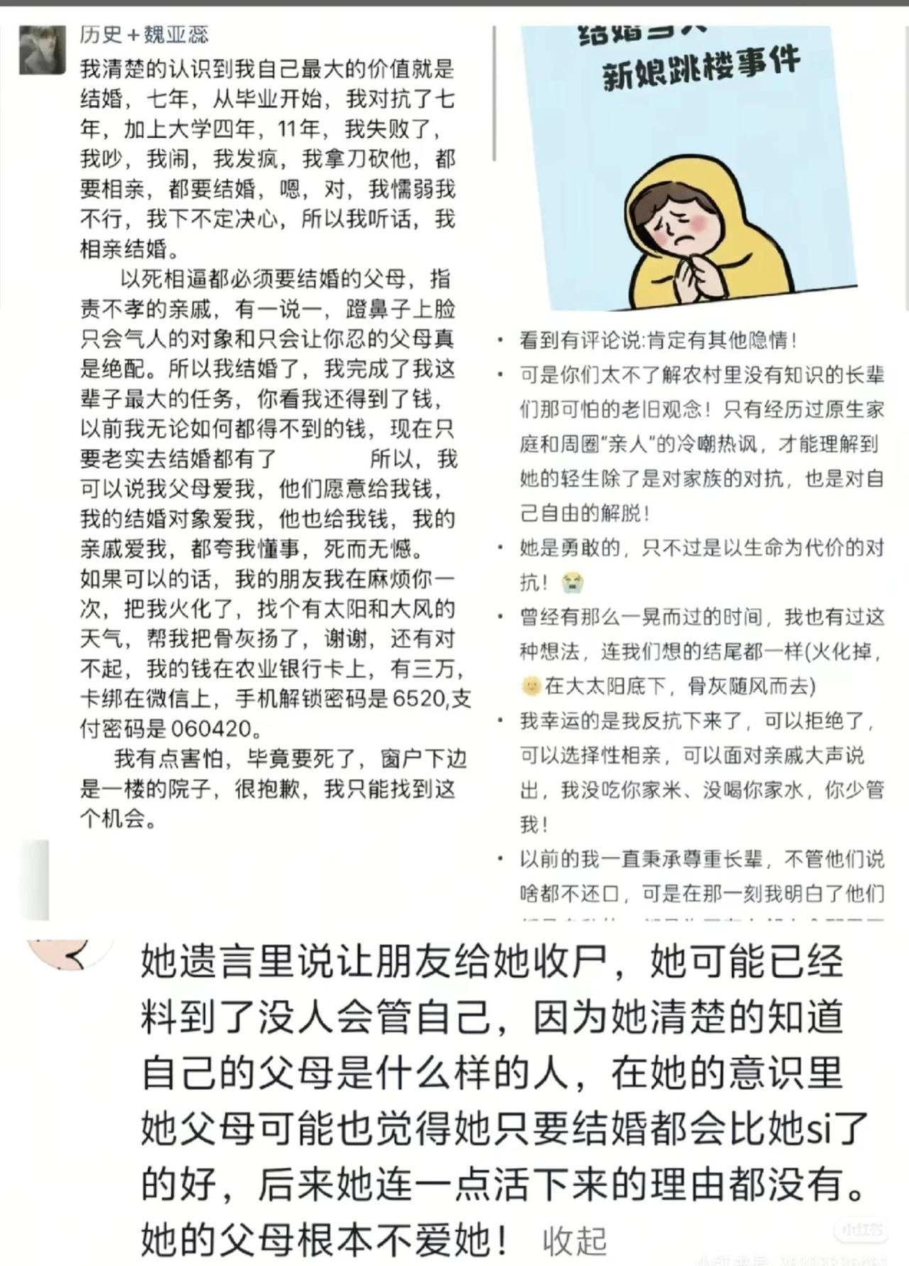 如何看待鲁山28岁女教师婚礼当日跳楼? 网传某地某位女性婚礼当天坠楼身亡 死前发的朋友圈 ------------------------------------ 说她不考虑她人吧,她想到了钱的处理,骨灰的处理,处处透露着不给他人添麻烦的气息,说她考虑她人吧,她却没有想到一楼的那家人怎么办的问题