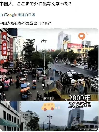 日本网友发了个帖子,对着两张东方大国街景照怀疑人生。 09年人山人海,25年空空荡荡。 甚至还在X平台上煞有介事地分析:这是经济不行了,还是东方大国人不爱出门了? 这种“日式忧虑”真是让人哭笑不得。 他们眼里的萧条,恰恰是我们生活方式的降维打击。 现在的年轻人,谁还没事儿上大街瞎溜达? 水电煤气动动手指,买菜购物半小时送达。 以前出门是为了生存和办事,现在出门是为了露营、看展、搞自我。 物理空间的冷清,是因为数字世界的极度喧嚣。 至于那种街头巷尾的偶遇与寒暄,早就在算法推荐里消亡了。 不懂的人,永远只看得到表象。 日本网友盯着中国街景瞎操心,真是没看懂时代变化。 09年挤大街是没办法,买东西办事都得跑线下;25年街上人少,是因为手机能搞定一切,外卖、网购半小时到,谁还瞎溜达。 这哪是经济不行,明明是我们的生活方式升级了。 现在出门不是为了生存,是去露营、看展找乐子。物理街上冷清,是因为大家都在数字世界忙着享受。用老眼光看新事儿,只会被自己的认知困住。 各位读者你们怎么看?欢迎评论区留言~日本评论中国