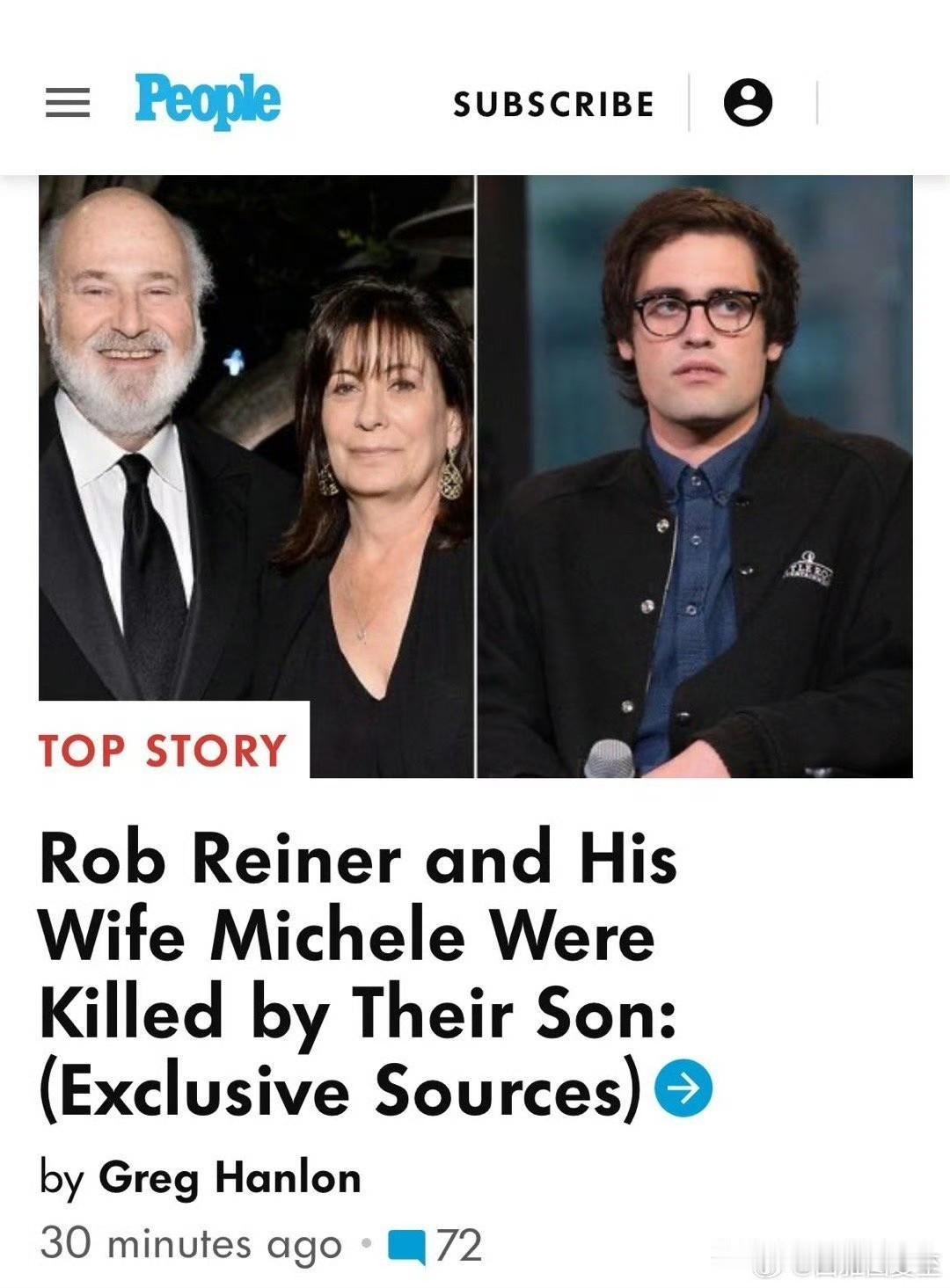 好莱坞著名演员、导演、制片罗伯·莱纳(Rob Reiner)及其妻子米歇尔·辛格(Michele Singer),在洛杉矶家中被刺身亡 据《人物》调查记者,是该夫妇的儿子所为。 当地时间2025年12月14日下午,78岁的罗伯·莱纳(Rob Reiner)与68岁的妻子米歇尔·辛格(Michele Singer)在洛杉矶布伦特伍德的住宅中被发现身亡。两人遗体均有刀具造成的多处撕裂伤,警方以谋杀案立案调查,并定性为“家庭事件”。遗体由其27岁的女儿罗米·莱纳(Romy Reiner)报警后发现。 据《人物》(People)杂志等多家媒体援引执法部门匿名消息源,主要嫌疑人为夫妇32岁的儿子尼克·莱纳(Nick Reiner)。尼克长期吸毒,青少年时期多次流落街头、进出戒毒机构,其经历曾改编为罗伯执导的电影《成为查理》(2015年),尼克担任联合编剧。