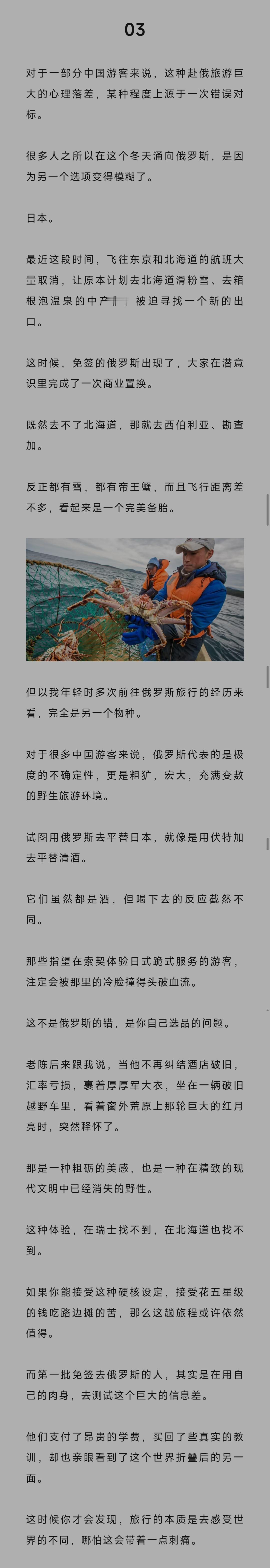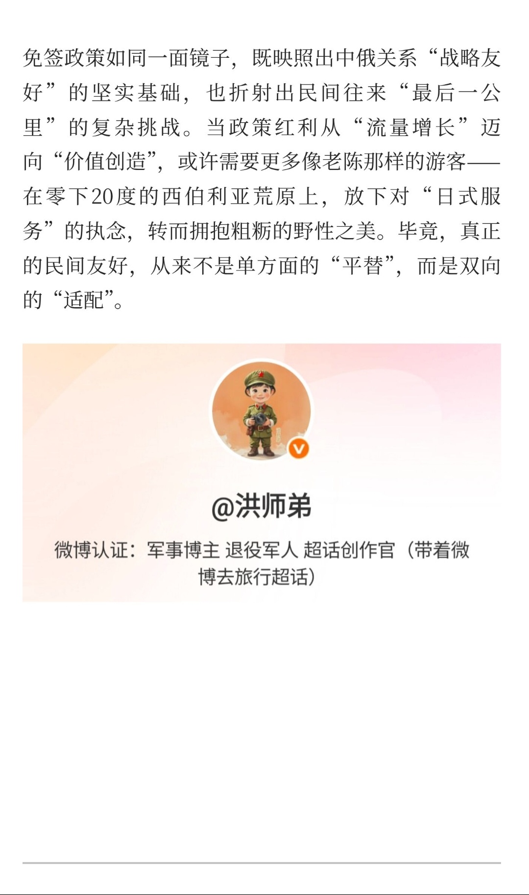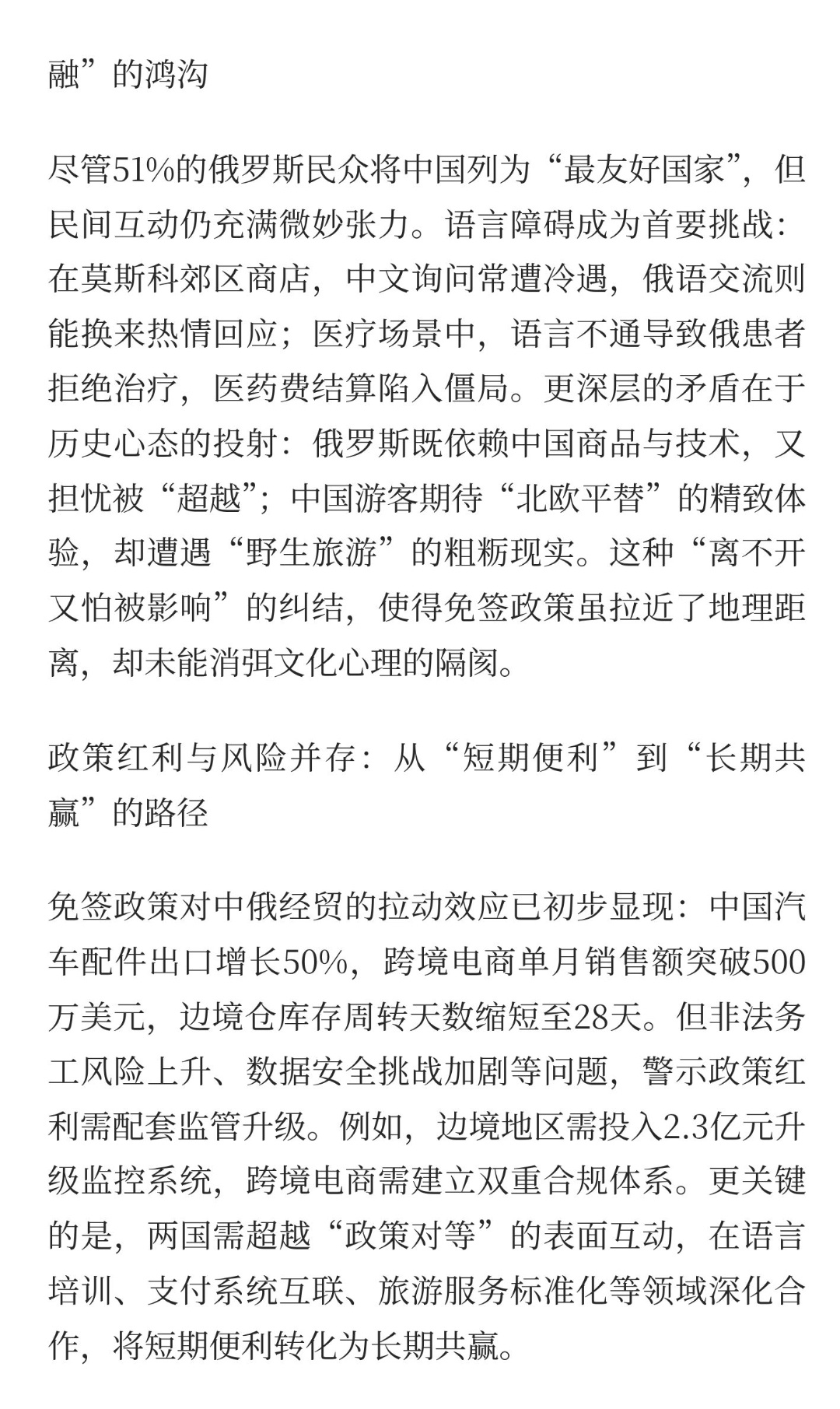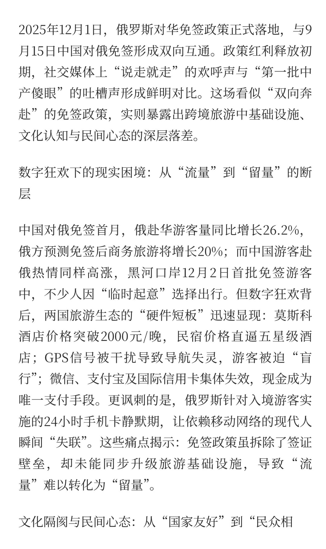 | 2025年12月1日,俄罗斯对华免签政策正式落地,与9月15日中国对俄免签形成双向互通。政策红利释放初期,社交媒体上“说走就走”的欢呼声与“第一批中产傻眼”的吐槽声形成鲜明对比。中国对俄免签首月,俄赴华游客量同比增长26.2%,俄方预测免签后商务旅游将增长20%;而中国游客赴俄热情同样高涨,黑河口岸12月2日首批免签游客中,不少人因“临时起意”选择出行。但数字狂欢背后,两国旅游生态的“硬件短板”迅速显现:莫斯科酒店价格突破2000元/晚,民宿价格直逼五星级酒店;GPS信号被干扰导致导航失灵,游客被迫“盲行”;微信、支付宝及国际信用卡集体失效,现金成为唯一支付手段。更讽刺的是,俄罗斯针对入境游客实施的24小时手机卡静默期,让依赖移动网络的现代人瞬间“失联”。这些痛点揭示:免签政策虽拆除了签证壁垒,却未能同步升级旅游基础设施,导致“流量”难以转化为“留量”。尽管51%的俄罗斯民众将中国列为“最友好国家”,但民间互动仍充满微妙张力。语言障碍成为首要挑战:在莫斯科郊区商店,中文询问常遭冷遇,俄语交流则能换来热情回应;医疗场景中,语言不通导致俄患者拒绝治疗,医药费结算陷入僵局。更深层的矛盾在于历史心态的投射:俄罗斯既依赖中国商品与技术,又担忧被“超越”;中国游客期待“北欧平替”的精致体验,却遭遇“野生旅游”的粗粝现实。这种“离不开又怕被影响”的纠结,使得免签政策虽拉近了地理距离,却未能消弭文化心理的隔阂。免签政策对中俄经贸的拉动效应已初步显现:中国汽车配件出口增长50%,跨境电商单月销售额突破500万美元,边境仓库存周转天数缩短至28天。但非法务工风险上升、数据安全挑战加剧等问题,警示政策红利需配套监管升级。例如,边境地区需投入2.3亿元升级监控系统,跨境电商需建立双重合规体系。更关键的是,两国需超越“政策对等”的表面互动,在语言培训、支付系统互联、旅游服务标准化等领域深化合作,将短期便利转化为长期共赢。免签政策如同一面镜子,既映照出中俄关系“战略友好”的坚实基础,也折射出民间往来“最后一公里”的复杂挑战。当政策红利从“流量增长”迈向“价值创造”,或许需要更多像老陈那样的游客——在零下20度的西伯利亚荒原上,放下对“日式服务”的执念,转而拥抱粗粝的野性之美。毕竟,真正的民间友好,从来不是单方面的“平替”,而是双向的“适配”。