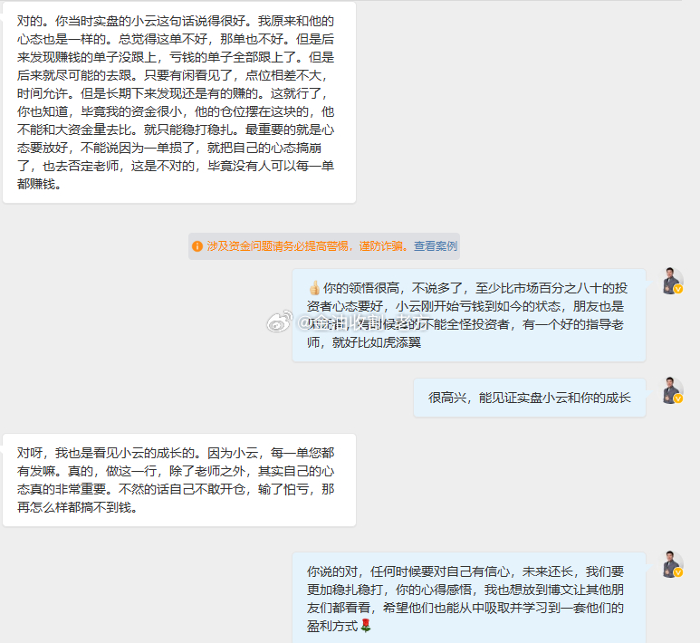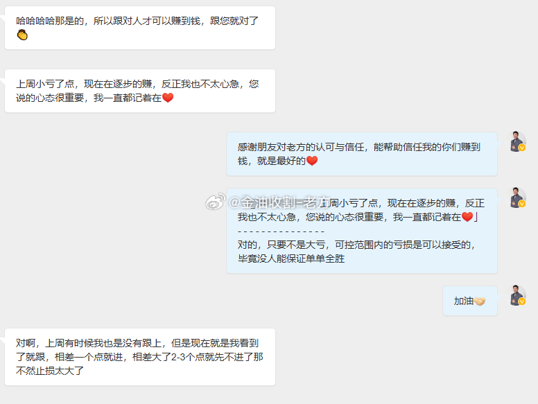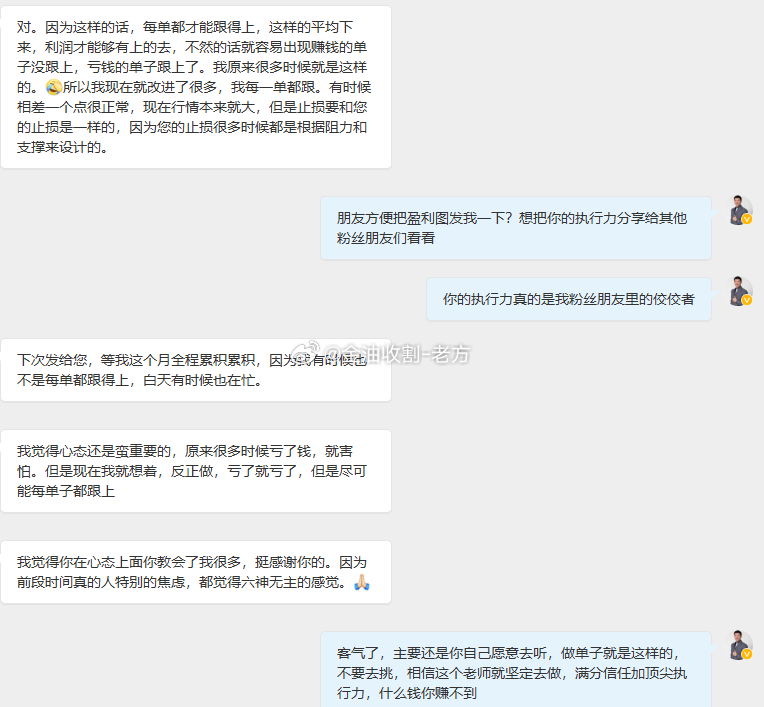 跟单粉丝再度跟上收割 大家可以看看这位粉丝朋友,为什么能在老方的开导下将心态调整的越来越好,为什么慢慢开始和实盘小云一样盈利比亏损多,一直在市场没有成绩的朋友们,老方真心建议大家认真看一下,盈利离你真的没有那么遥远来到市场,无一不是为了利。。。投资做为勇敢者的游戏。那么做为一名投资者,你是否在进场以后敢于持仓并百分百听指导老师的减仓、离场???想盈利很简单,百分百去信任自己的指导老师,坚定执行他给出的策略,不要挑单子,不要因为亏了些钱就一直纠结,要自己尝试去调整心态,因为心态不好,后续的单子你是不可能敢持仓拿大利润的。能做到我说的这些,你大概率能摆脱亏钱的状态。稳健执行,时间和你的账户资金不会骗你,希望老方的分享能为还在海里的朋友带去一丝翻身、挽损的希望。离过年只有最后两个月了,没有人不想风光回家乡,不论大小资金,只要能达到老方团队的风控门槛,老方团队愿意为你的归家路注入自己的一份力金油趋势实战大师-老方黄金金价