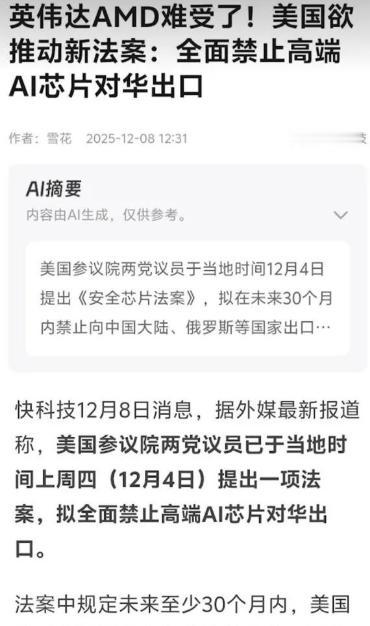 差点要被黄仁勋笑死,刚说好英伟达可以卖H200给中国,中国还没表态要不要,大美丽两党议员联手提出了新的《芯片安全法案》,规定未来2年半的时间里,禁止任何高端AI芯片出口至中俄伊等国。得!空高兴一场!   刚被黄仁勋搅热的AI芯片市场,转眼就被美国政客浇了盆凉水。   当地时间12月8日,特朗普突然在社交平台宣布,批准英伟达向中国“经批准的客户”出售H200芯片,还特意强调要抽走25%的销售收入。   这消息刚让科技圈议论纷纷,大家还没等中国企业表态,另一边美国两党议员早就备好“后手”——12月4日就联合提出了《SAFE法案》,直白要求未来30个月里,彻底禁止向中国、俄罗斯等国出口任何高端AI芯片。   这波操作真是让人看懵了,要知道H200可不是普通芯片,性能比之前获准出口的H20强了近6倍,能大幅提升AI大模型的训练效率。   黄仁勋为了这事费了不少劲,从5月就开始游说,反复说限制出口只会逼中国搞自主研发,最后美国企业得丢市场。   现在看来,他的游说似乎成了“无用功”,毕竟法案一旦通过,商务部连豁免的权力都没有。   说白了,美国内部这矛盾早不是秘密,特朗普想着靠卖芯片赚钱,25%的抽成能直接进政府口袋,还能稳住英伟达股价带动股市;但议员们更怕技术外流,参议员库恩斯就直言,不能把AI时代的“技术钥匙”让给中国。   可他们没算明白,这两年的封锁已经起了反效果,华为昇腾920性能早赶上H20了,DeepSeek、阿里的大模型也能和美国的掰手腕。   对中国企业来说,这事反倒没那么纠结,H200虽好用,但25%的抽成抬高了成本,而且之前H20还被查出有安全后门,谁也不想再踩坑。   现在国产芯片已经能顶上来,华为昇腾的集群规模都超万卡了,寒武纪、壁仞这些企业也在补生态短板。   短期或许会买些H200救急,但长期肯定还是靠自己,毕竟被“卡脖子”的滋味不好受。   美国科技界其实也反对这禁令,甲骨文创始人骂这是“最具破坏性的政策”,半导体行业协会警告年损失会超500亿美元。   黄仁勋说得没错,过度限制只会让美国永久失去中国市场。   现在这出“松绑又加码”的戏码,说到底还是想在技术上卡中国脖子,又不想丢了赚钱的机会。   只是他们可能忘了,中国搞自主创新的决心早就定了。不管这法案能不能通过,国产芯片的研发都不会停。   等哪天我们自己的芯片既能“可用”又能“好用”,美国再怎么折腾也没用了。   以上都是个人观点,对此您有什么不同的看法,可以在评论区留言讨论!!!
