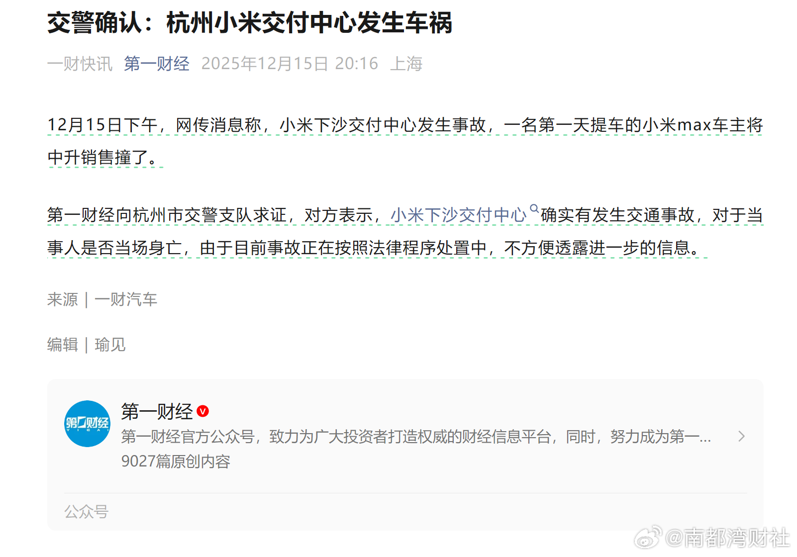 【交警确认:杭州小米交付中心发生车祸】#交警确认杭州小米交付中心发生车祸# 12月15日下午,网传消息称,小米下沙交付中心发生事故,一名第一天提车的小米max车主将中升销售撞了。第一财经向杭州市交警支队求证,对方表示,小米下沙交付中心确实有发生交通事故,对于当事人是否当场身亡,由于目前事故正在按照法律程序处置中,不方便透露进一步的信息。(一财快讯)