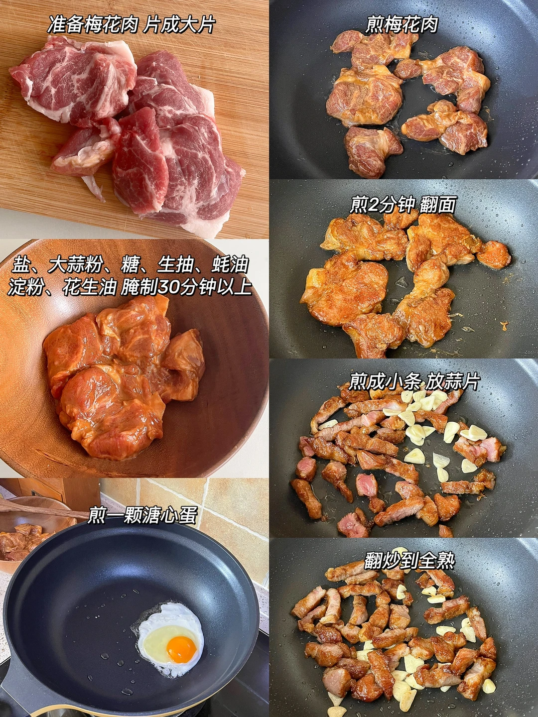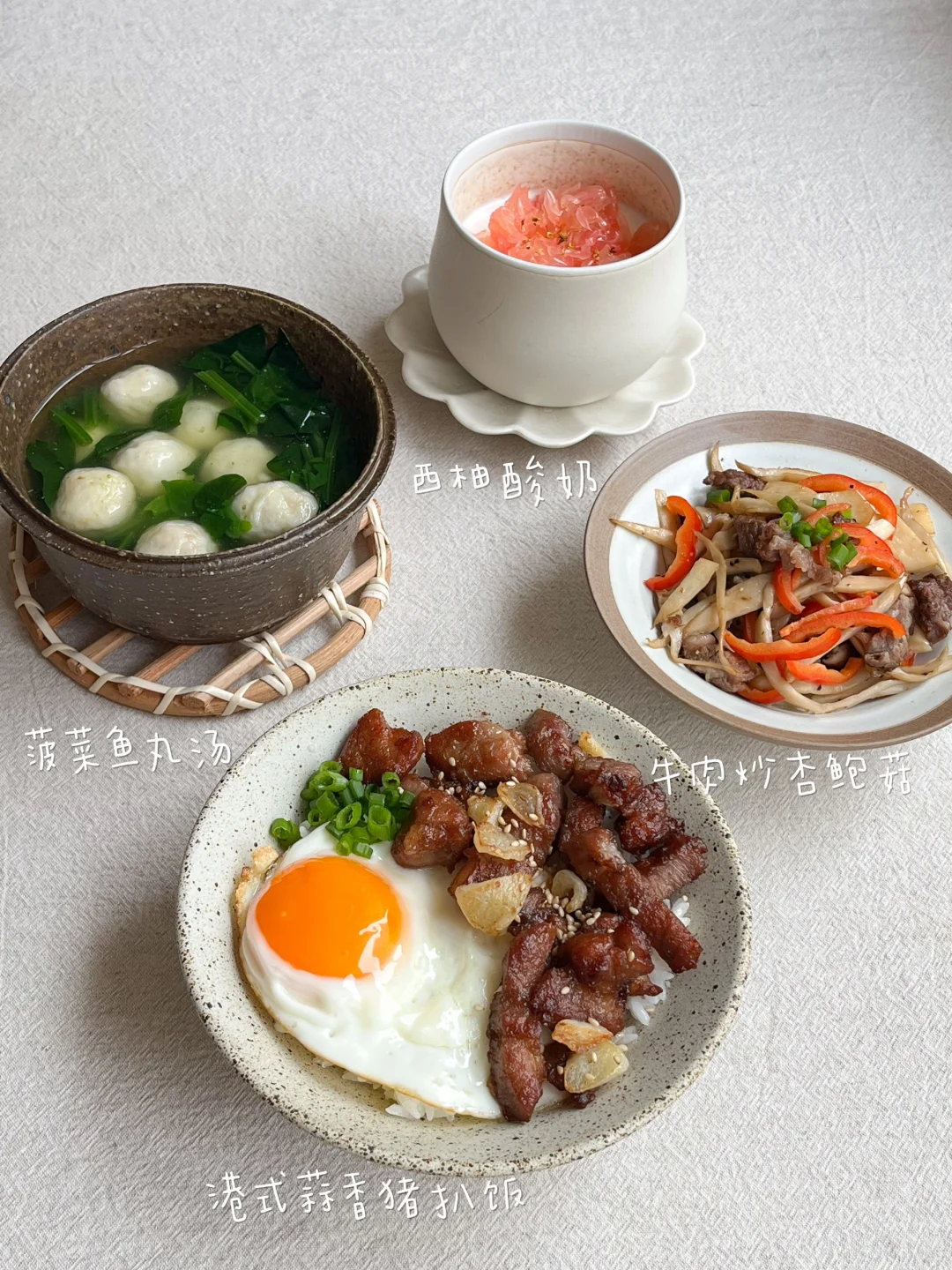 今天的饭: 港式蒜香猪扒饭🍖 牛肉粒炒杏鲍菇🍄 菠菜鱼丸汤🍢 西柚酸奶🍨 每次去茶餐厅我都喜欢点猪扒包和菠萝油 其实很简单 在家也能做出来 一次多腌点 想吃的时候用烤箱烤一下 easy~ 梅花肉切中厚款 用刀把筋那里划几下 腌料就是日常那些:盐、生抽、蚝油、白糖 我喜欢放一点大蒜粉 最后加红薯淀粉、花生油 抓拌均匀腌制30分钟以上 就可以下锅煎了 煎到八分熟剪成小块 放大蒜片 再煎2-3分钟 蒜香浓郁 而且肉也很嫩哦 配一颗溏心蛋完美~