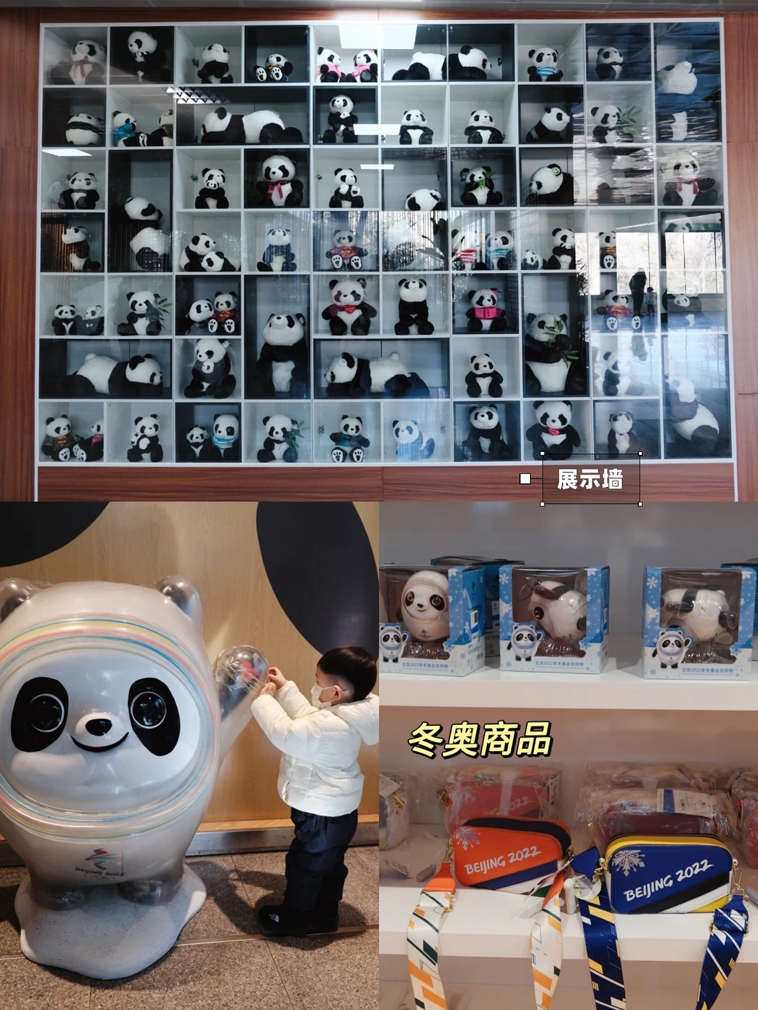 从熊猫馆进来,在室外看完熊猫就来到了奥运熊猫馆。一层是室内熊猫馆和各种熊猫周边,连天花板上都是熊猫造型的圆灯🐼,细节感满满。还有冬奥主题的正版周边,小朋友简直走不动路😍
