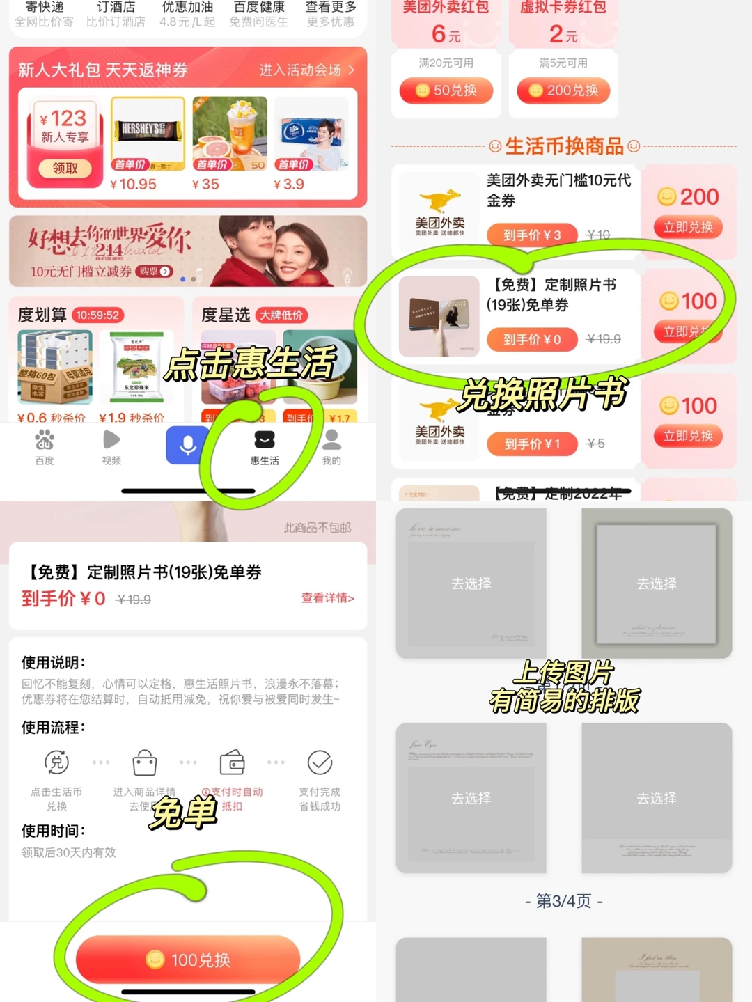 2️⃣打开Bai-Du(中文)APP-底部“惠生活”-领取100金币-兑换定制照片书免单券
