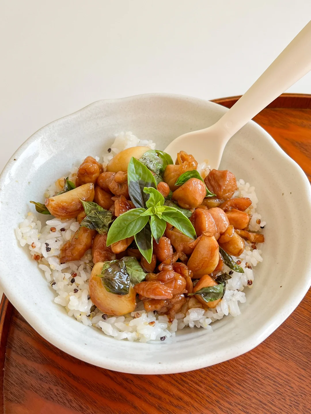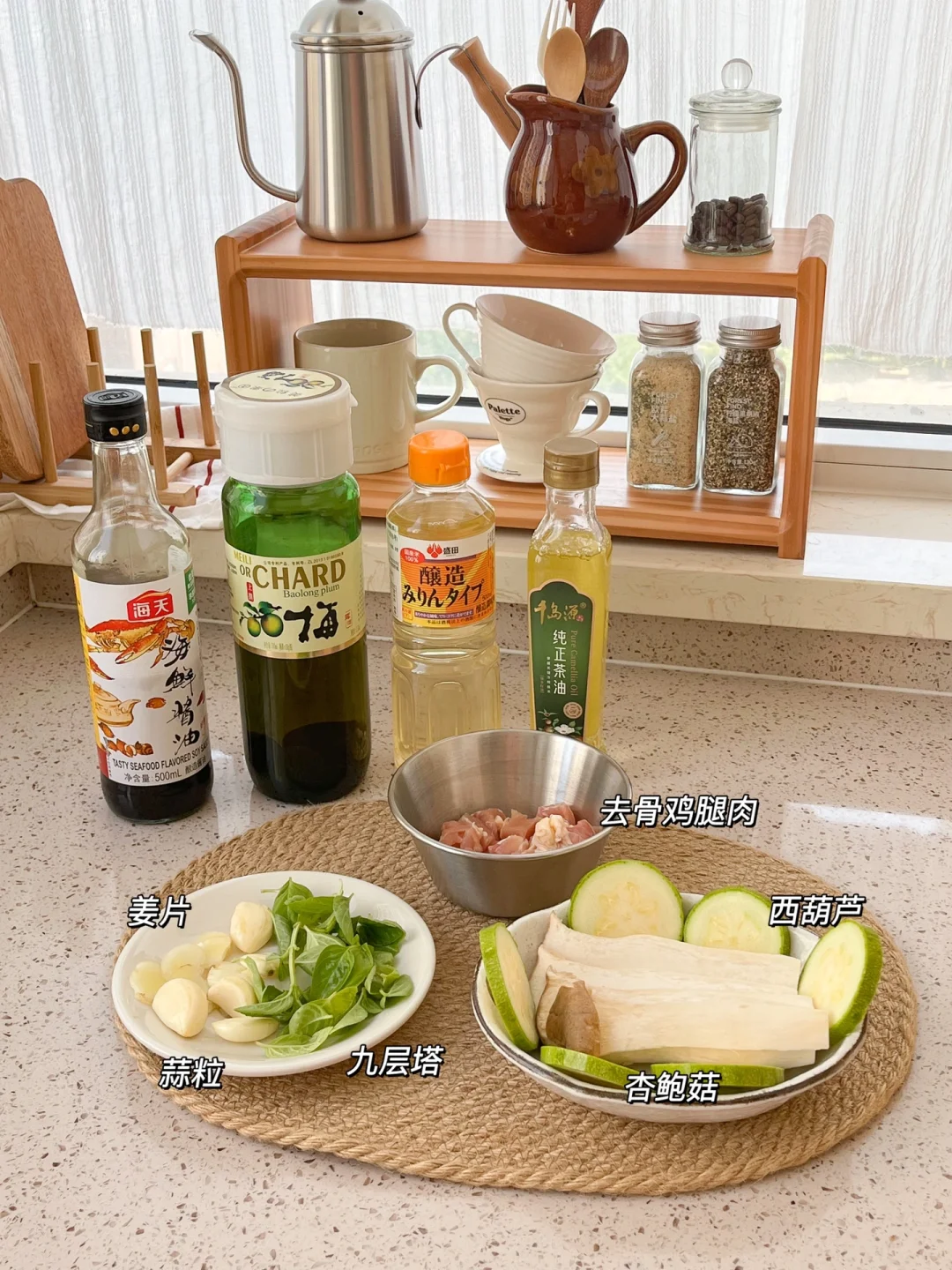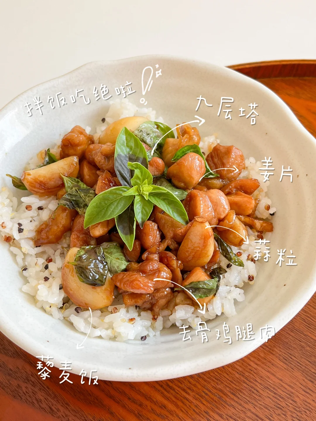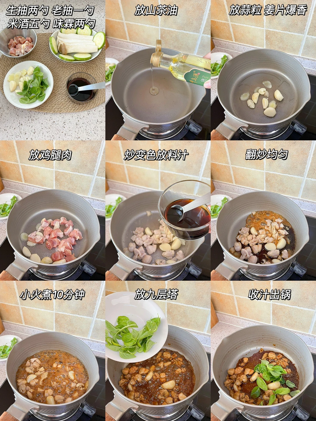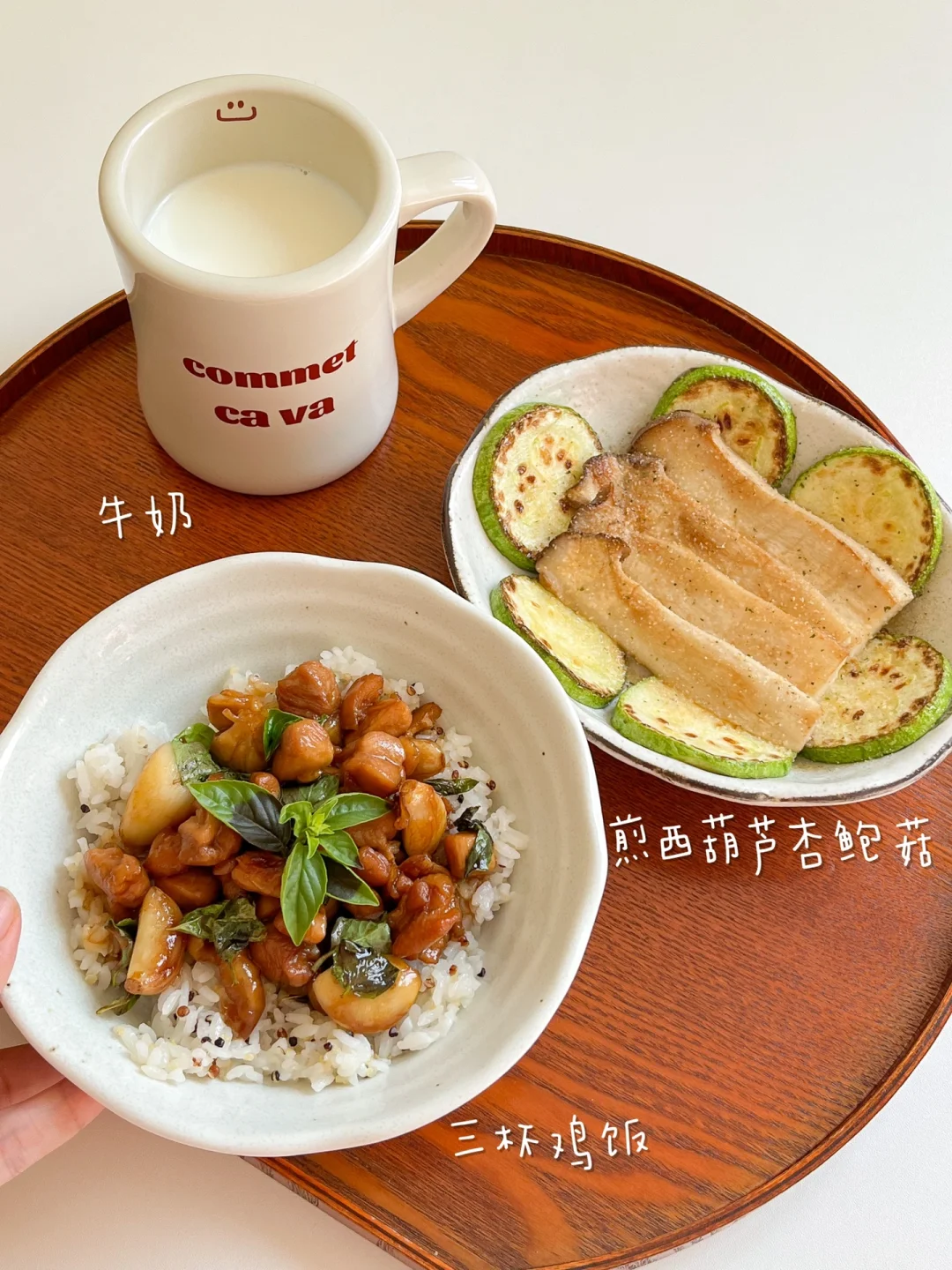 “相比餐厅和餐外卖,自己在家做料理味道更好也更干净。品类多、蔬菜多、调料少,是我现在饮食的三大关键。” 今日午餐: ¹三杯鸡饭 ²煎西葫芦杏鲍菇 ³牛奶 🟠三杯鸡饭 今天复刻了台式三杯鸡,种了一夏天的九层塔终于用上了~自己在家也能做出来好味道!用鸡翅或鸡腿都可以,调好的料汁味道很丰富,配上一碗藜麦饭,又是健康的一顿午餐 🟢煎西葫芦杏鲍菇 有的蔬菜煎一煎就很好吃,比如蘑菇和西葫芦。用山茶油可以激发出菌菇特有的香味,煎到两面微微焦,放点欧芹大蒜盐,最好吃了!
