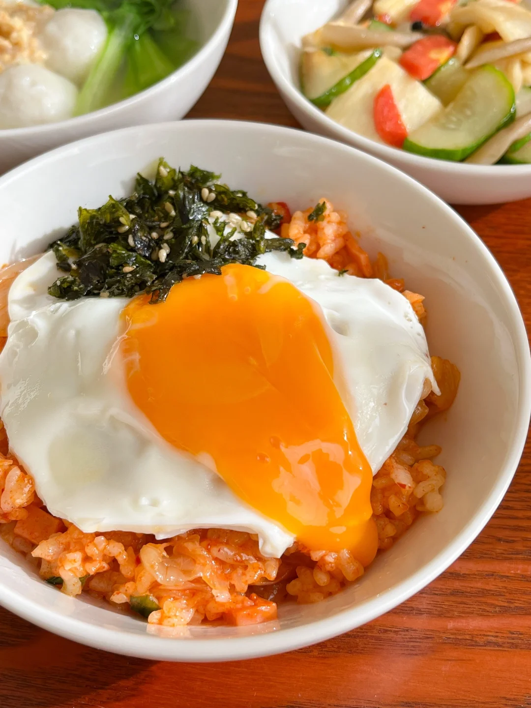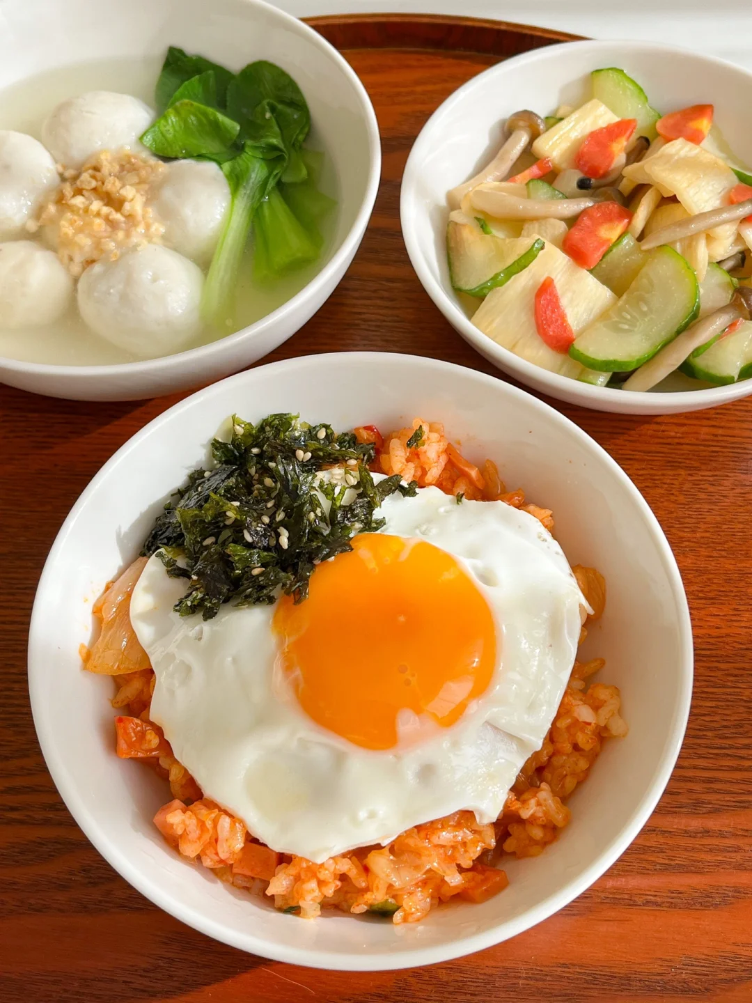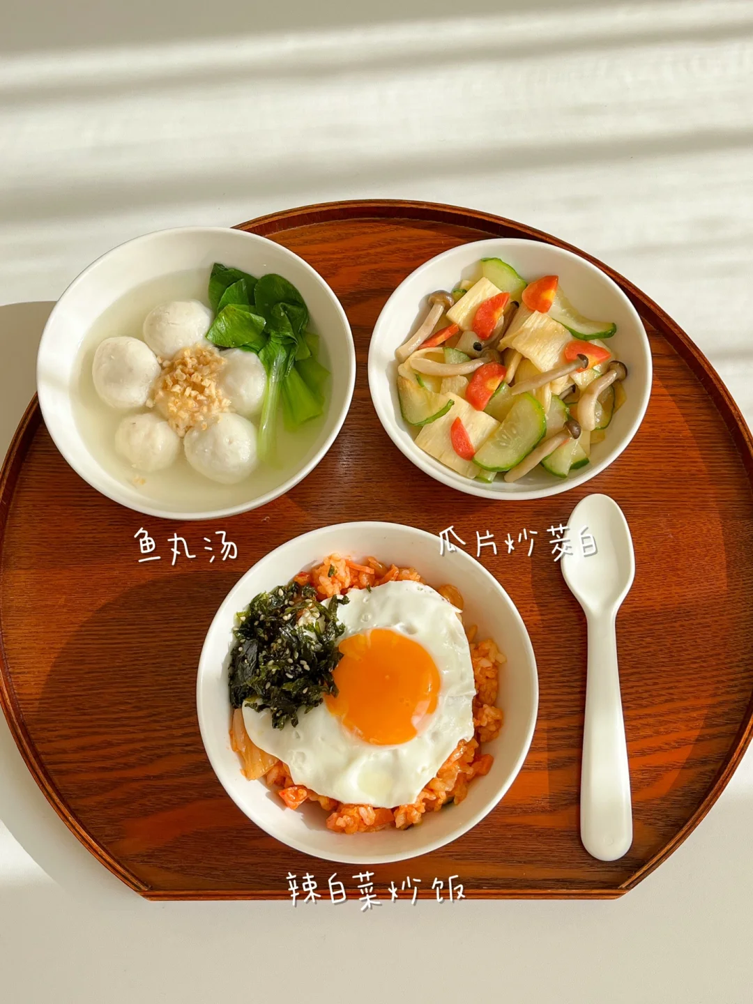 “我很喜欢现在的生活状态,随心做饭,看着冰箱里的食材想着怎么搭配着吃掉它们,我也喜欢逛菜场买菜,每样蔬菜都放一点,不需要吃很多,也不要吃到撑。” 今日午餐: ¹辣白菜炒饭 ²瓜片炒茭白 ³鱼丸汤