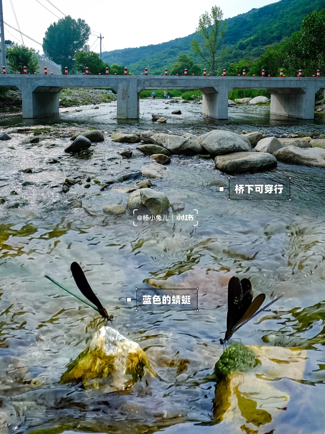 水浅至脚踝,河水偏缓,水质清澈,可以捡石头,还有一大片蓝色的蜻蜓在低空飞来飞去,适合小童。