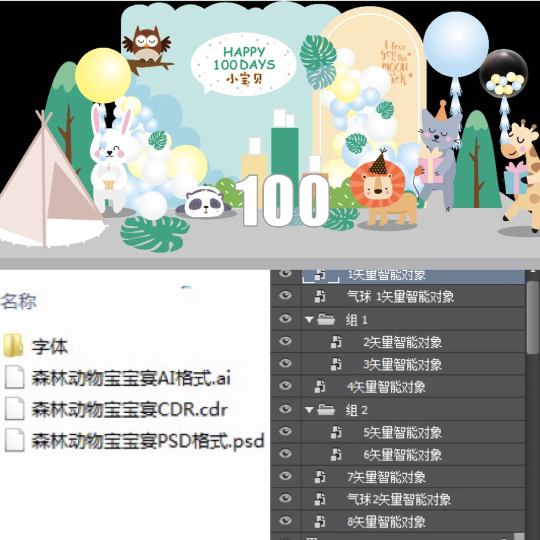 🐰这款【森林动物】主题是我最喜欢的,男宝女宝都适合。画面中的每一个图层都是可以单独打印放置的,像小动物、树、草丛都是单独的,可以根据场地的情况随意布置,更改位置。
