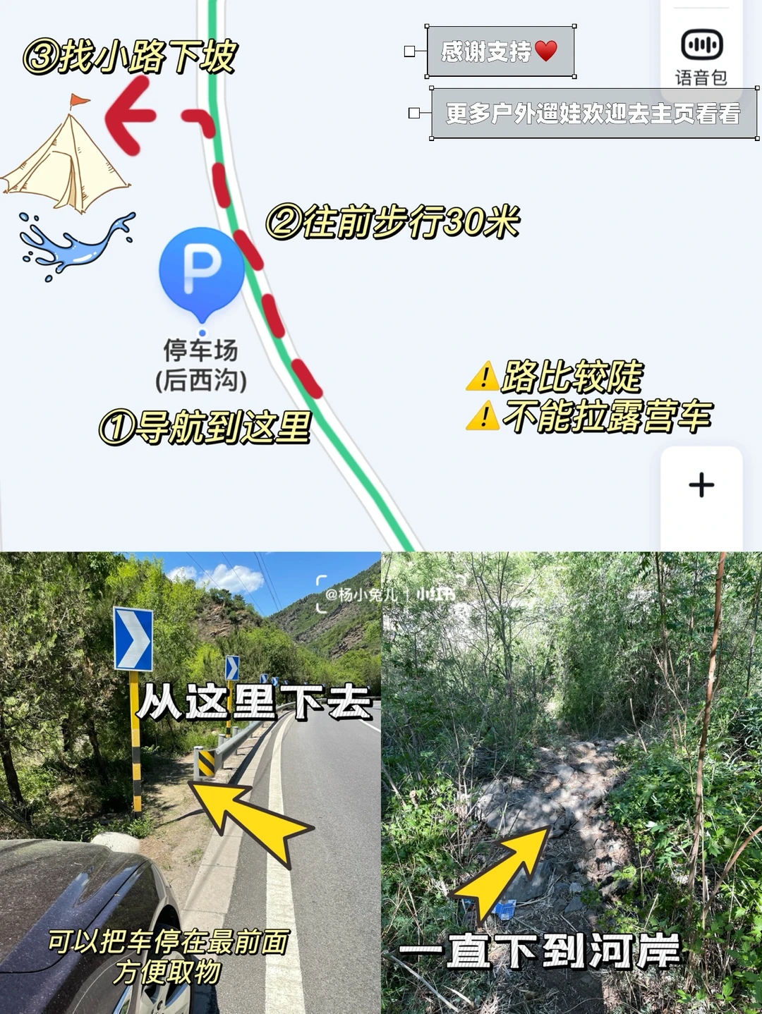 💡停好车,往北走30米,路标旁边有一条小路,下坡就可以抵达溪水旁边