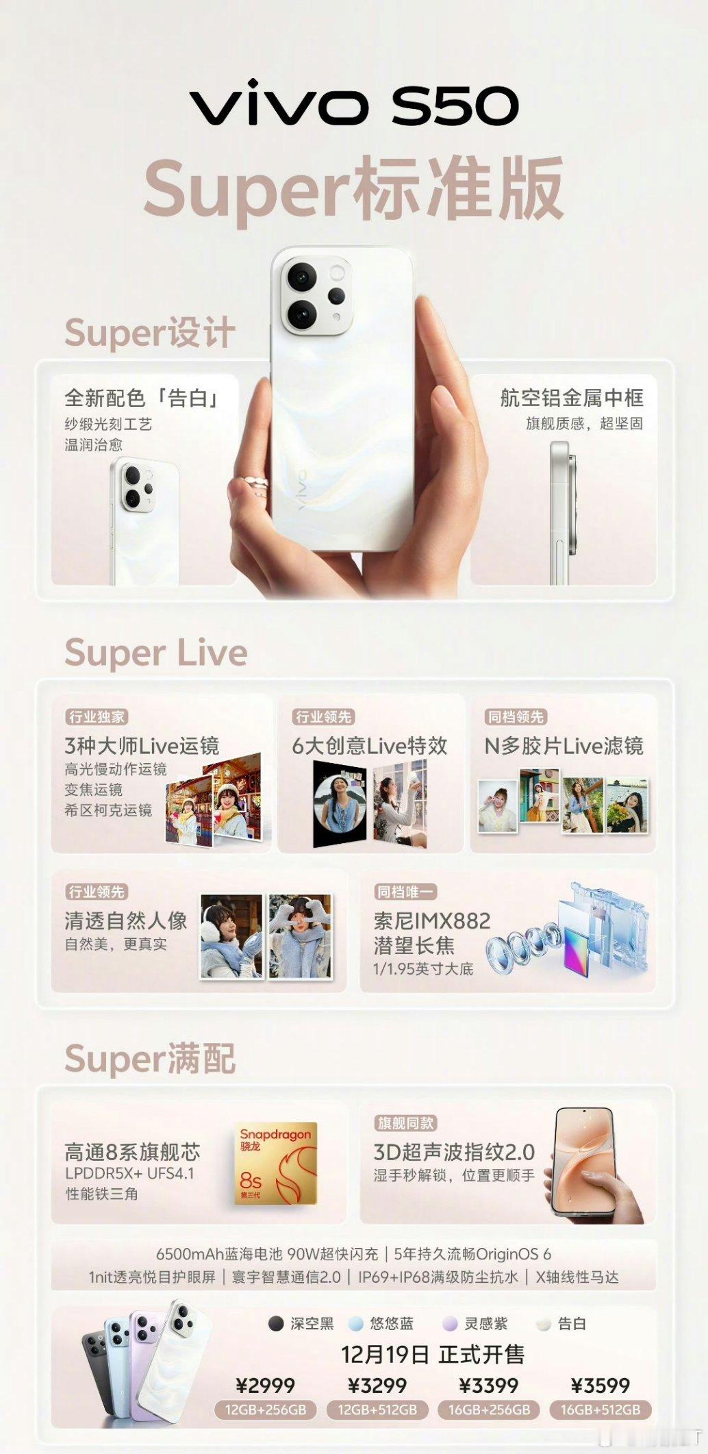 今晚有一场vivo S50系列新品手机发布会。首先发布的是vivo S50。四款配色分别是告白、悠悠蓝、灵感紫、深空黑。vivo S50的影像功能超级强,蓝厂看家算法升级,拍出自然“妈生好皮”。还有4K封面帧、4K换帧增强、4K视频转Live功能。用S50记录生活,Live每天都不重样。