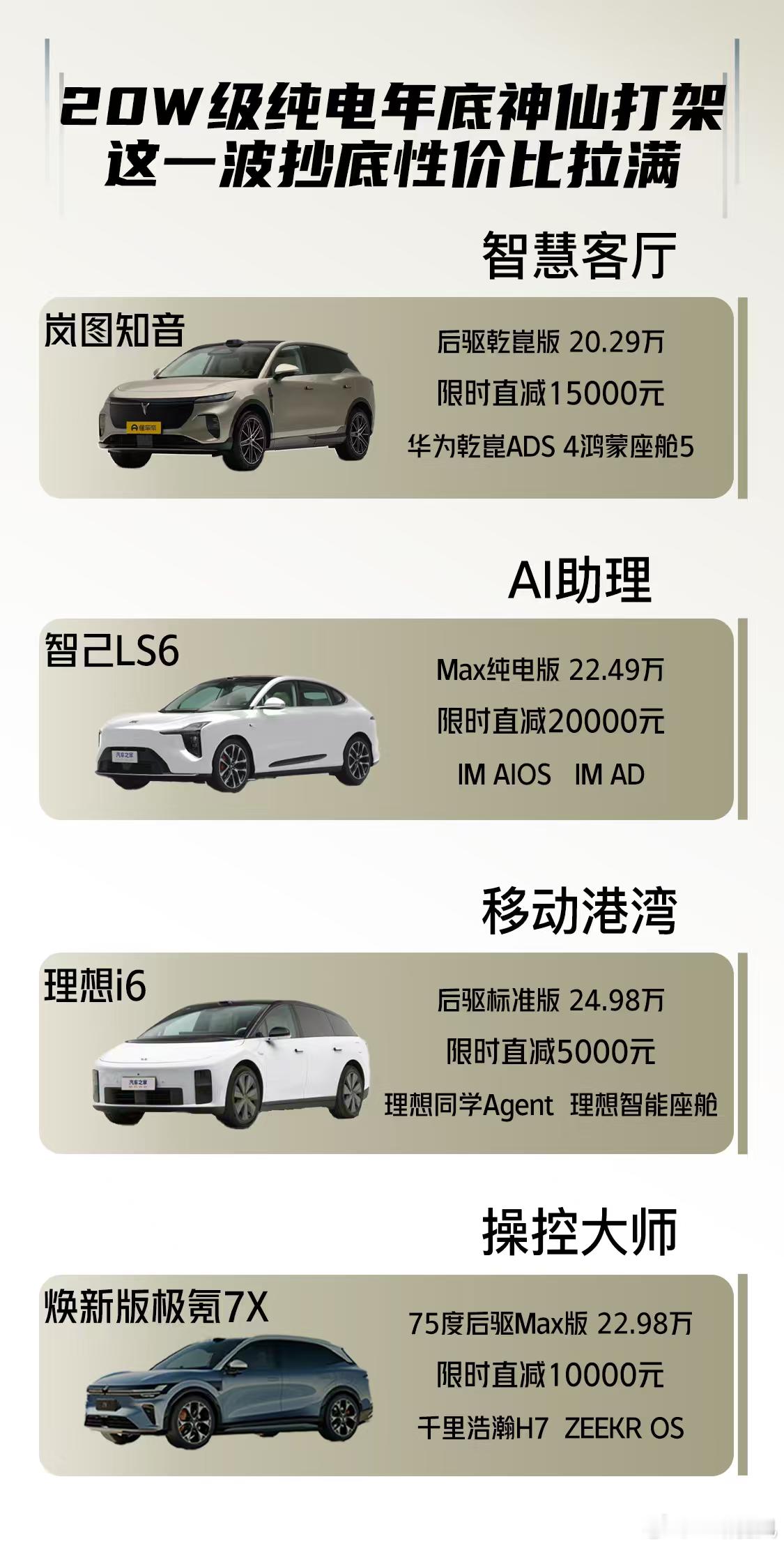 这些车企年底是这么玩的?年底想买纯电的闭眼冲!20W级纯电赛道现在就是神仙打架,优惠+配置把性价比堆到溢出。岚图知音直降1.5W,华为ADS 4+鸿蒙座舱直接把车变成“智慧客厅”;智己LS6砍2W,IM AIOS+IM AD把“AI助手”标签焊死;理想i6少5k,理想同学Agent让车成为“移动港湾”;极氪7X减1W,操控拿捏到大师级!这波不薅感觉亏了一个亿!岚图知音 智己LS6理想i6 极氪7X买车福利
