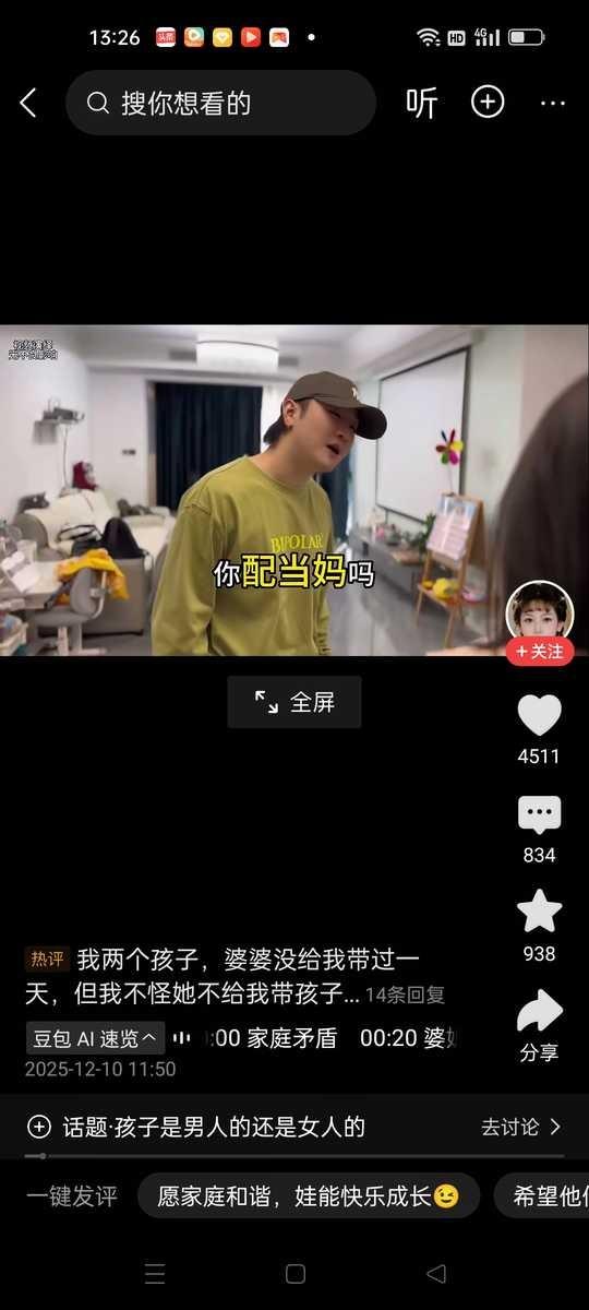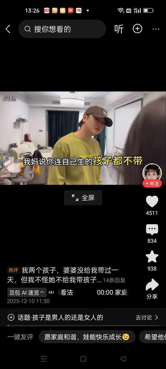 我妈说你连自己生的孩子都不带,你配当妈吗? 这句话从男人嘴里出来,我就知道这局彻底没救了。 一个丈夫,把自己亲妈的指责,一字不差地转述给自己的妻子。这甚至不是他自己想出来的话,他只是个传话筒。这背后是什么?是整个家庭系统性的甩锅和围剿。婆婆在道德高地上指手画脚,丈夫麻木不仁地递刀,所有的火力都精准地指向了那个被默认应该承担一切的妈妈。 网上都说这妻子怼得解气,是爽文剧情。看的时候确实拳头都硬了,觉得出了一口恶气。但那股爽劲儿过去之后,心里反而更堵得慌。因为你知道,这种“怼赢”的背后,是日复一日“说不通”的疲惫积累起来的。她不是天生就这么能说会道,是无数次的沉默和退让,才换来这一次的爆发。 这事儿的根子,从来就不是谁带孩子。而是一个女人,在“妻子”和“母亲”这两个身份里,被整个家庭系统性地剥夺了“人”的资格。她的付出是应该的,她的委屈是矫情,她的反抗就是“不配”。他们用一套完美无瑕的“传统”模具往她身上套,套不上就是你不对。这根本不是家务分工,这是一场针对个人意志的慢性绞杀。 所以别光看怼得爽。这根本不是什么婆媳矛盾或者夫妻吵架,这是一场单方面的精神围剿,只是这次,被围剿的人终于掀了桌子。