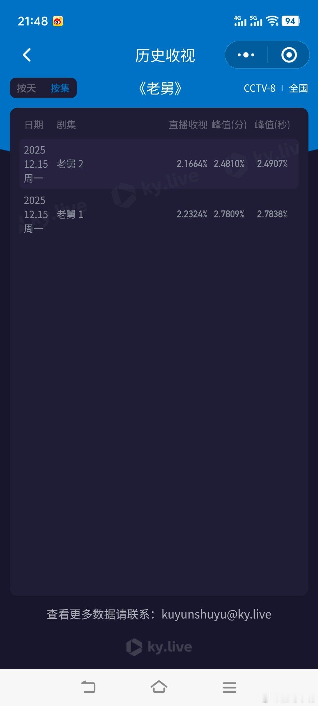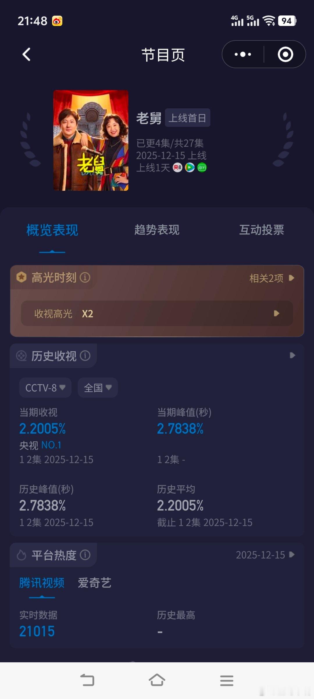电视剧老舅郭京飞 王佳佳《老舅》首播收视快报!首日双集酷云平均2.2005,峰值2.79--,双集走势如下:第一集:起点1.4421,峰值2.7838,平均2.2324第二集:起点1.9009,峰值2.4907,平均2.1664双集平均:2.2005cvb估值:2.2005×0.88=1.936老舅首播收视率