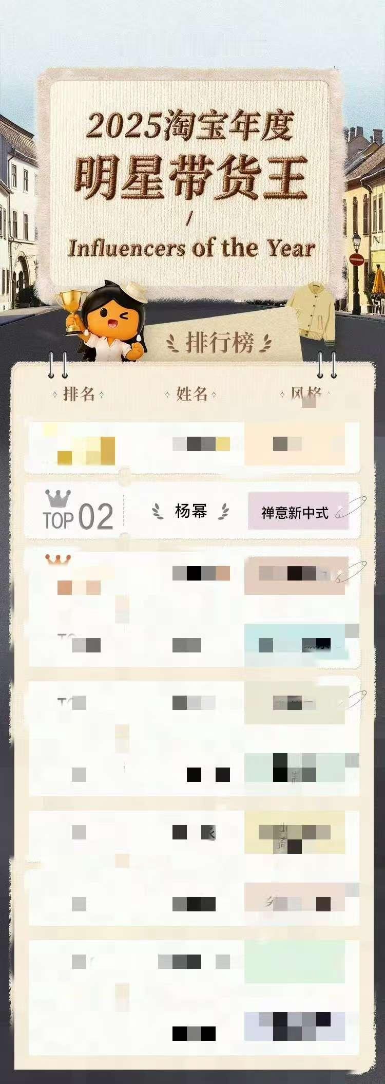 2025明星带货王2025十大单品榜上淘宝🍑搜“十大风格榜”最新发布。恭喜幂姐荣登2025淘宝年度明星带货王第二名!👑“禅意新中式”风格引领风尚,东方美学带货力MAX,不愧是人气与实力并存的时尚女王!💃