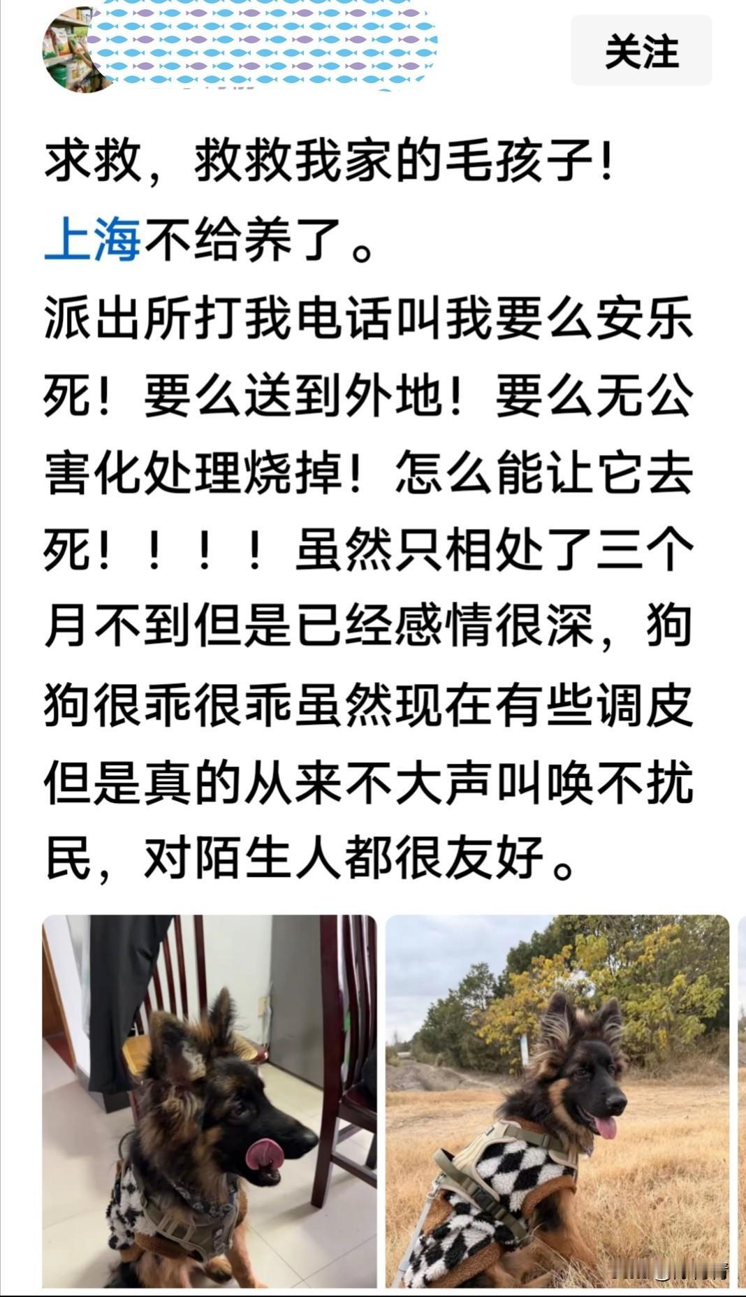 “救救毛孩子!上海不准养了,养这么大真舍不得丢呢。”网友着急了。 言语透露出焦虑,“派出所给打电话了,将狗送外地也行,安乐死也行,无公害烧掉深埋也可以!”意思就是不准再养了。 抱怨养了三个月德牧犬,有感情了。狗很调皮、很乖,别说咬人了,它从不大声犬叫扰民。 网友评论,“有的警犬就是德牧品种,德牧犬很聪明,又通人性,干啥不让养?狗狗是人类最亲近的朋友,请善待生命!” “上海做得好,德牧看着吓人,说不要人是假的,路上见过它低吼,扑咬人。” “不知道德牧犬是否属于烈性犬?我记得上海烈性犬饲养条件必须单家独户。” “建议你去上海郊区租一个大院子,在那里养狗方便,没人管你。” “很难受,中国这么大,怎么不给宠物狗一条生路?” “城市人多,不适合养狗。狗容易咬人,说不定传染狂犬病,上海不让养狗是对的,我们应该支持。” 上海不让养狗,爱狗的人你说咋办?。