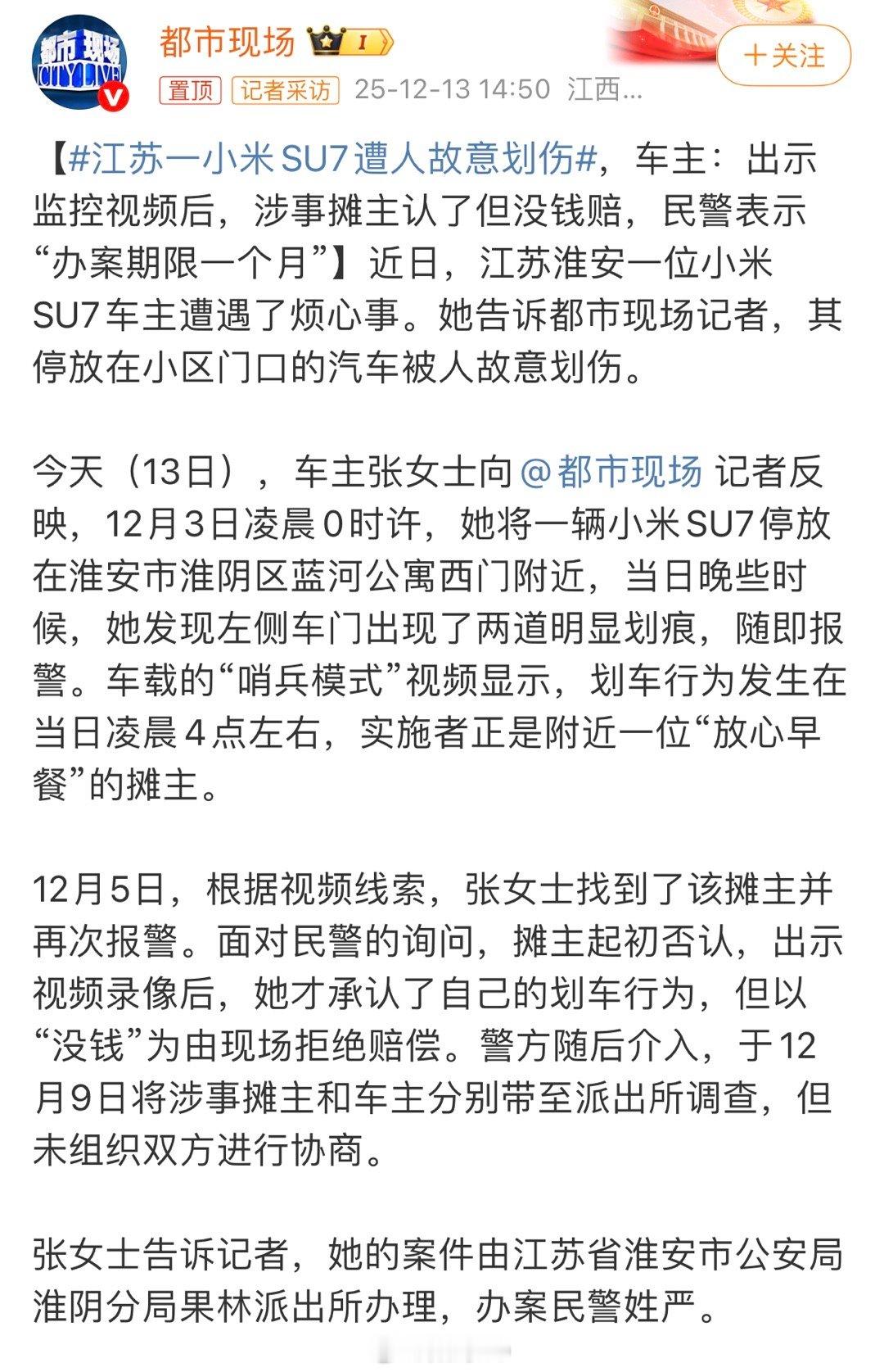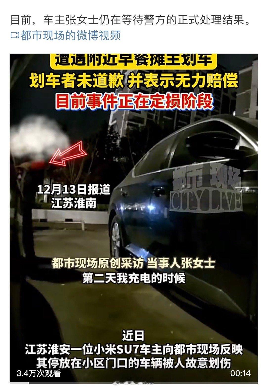 何必呢?故意划伤小米su7,,但以“没钱”为由现场拒绝赔偿,不过后续肯定是要赔偿的。
