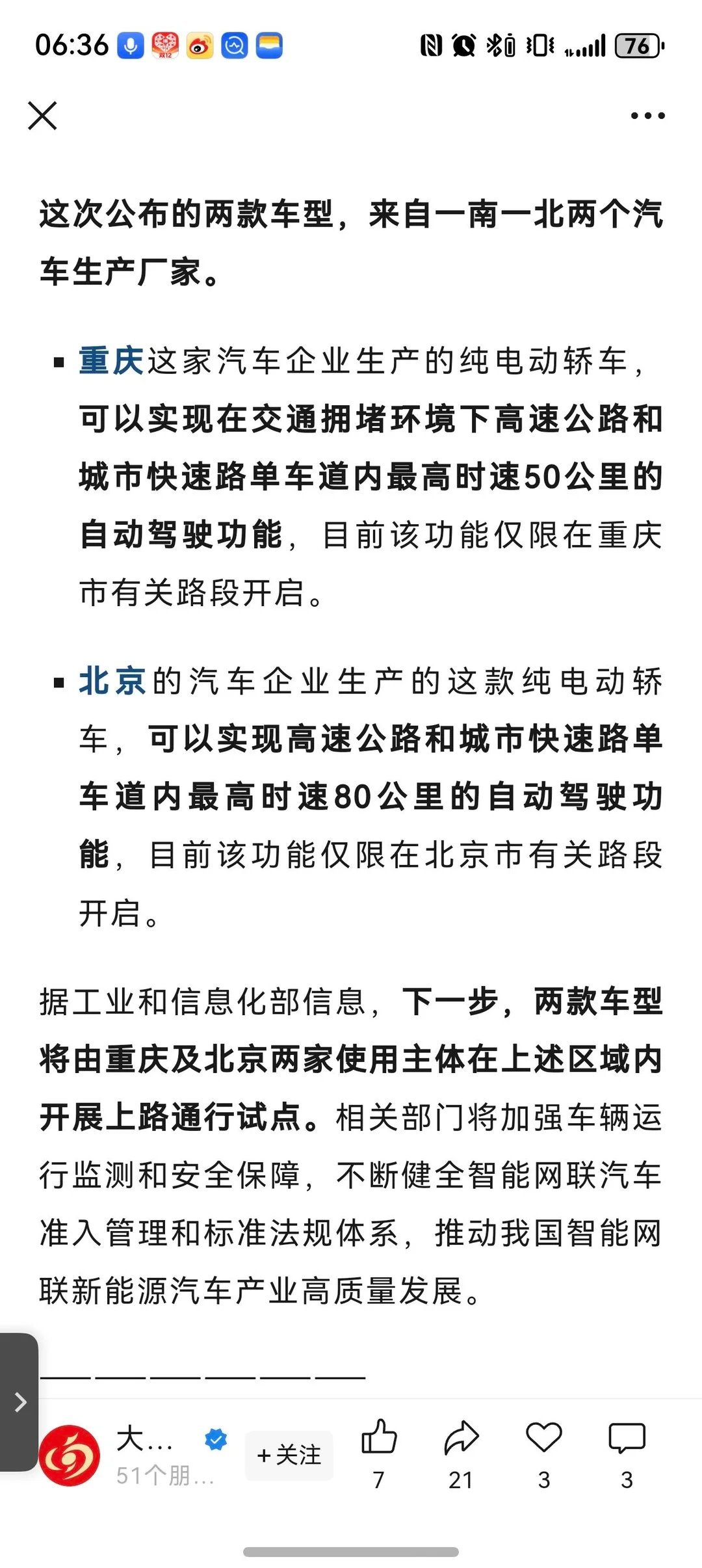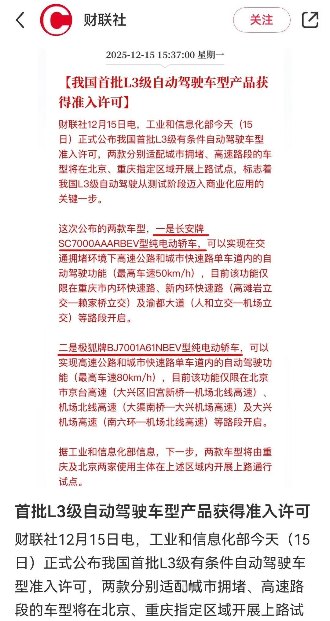 L3今天(15日),工业和信息化部正式公布我国首批L3级有条件自动驾驶车型准入许可,两款分别适配城市拥堵、高速路段的车型将在北京、重庆指定区域开展上路试点,标志着我国L3级自动驾驶从测试阶段迈入商业化应用的关键一步。这次公布的两款车型,来自重庆和北京财联社等媒体爆料这两家企业就是长安和北汽之前传了很久,这两家要拿第一批L3自动驾驶牌照,终于尘埃落地了还有人说这两家是赛力斯和小米,怎么可能[失望R]第一批肯定给国企啊,出事故方便兜底