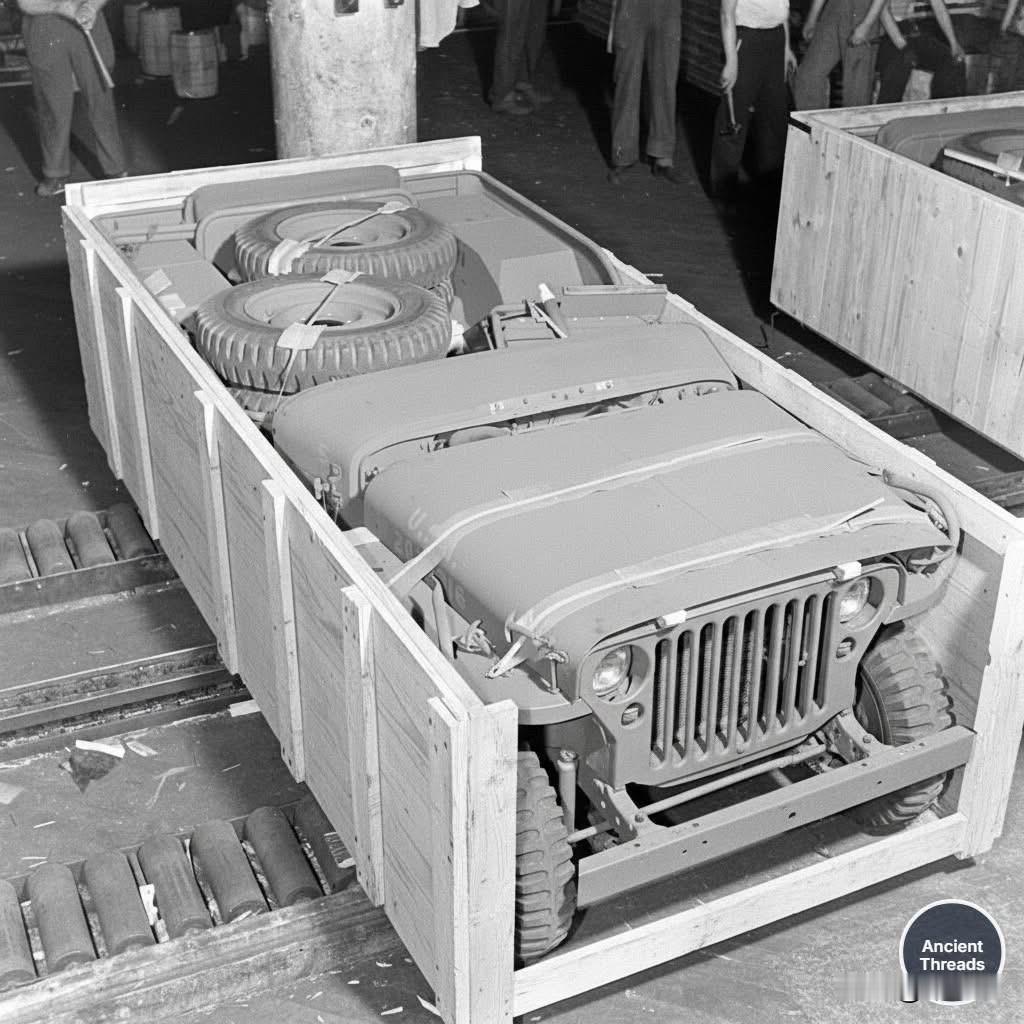 “装在箱子里的吉普车”。这些组装好的吉普车即将离开位于俄亥俄州托莱多的威利斯-奥弗兰工厂,摄于1942年。在二战期间,美国军方使用的70万辆吉普车中,约有33万辆是由威利斯-奥弗兰公司制造的。 关于“箱中吉普车” 高效运输:为了最大限度地提高货船上的空间效率,吉普车在装运前会被部分拆卸(例如折叠挡风玻璃、拆下车轮)并装入这些紧凑的板条箱中。 快速组装:到达目的地(如欧洲或太平洋战区的战地)后,士兵和当地工作人员可以在很短的时间内(有时甚至不到一小时)快速将这些车辆重新组装起来,投入使用。 生产商:二战期间,美国共生产了约64万辆吉普车,主要由 Willys-Overland 和福特(生产版本称为 GPW)两家公司制造。 物流传奇:这种创新的“平板包装”式运输方法确保了车辆以良好状态抵达前线,成为战时后勤的经典案例之一。