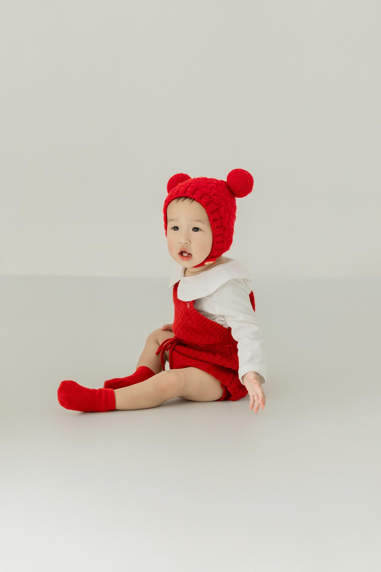 我家小宝贝的周岁照也太萌啦~一身红呼呼的针织小套装,配上圆滚滚的小绒球帽子,像颗刚出炉的红樱桃🍒。坐着的时候小嘴巴还微微张着,眼睛滴溜溜地看旁边,小模样软乎乎的,心都要化了~果然小朋友穿红色就是最喜庆的,每一帧都想珍藏,我的宝贝就这么慢慢长大吧~