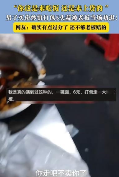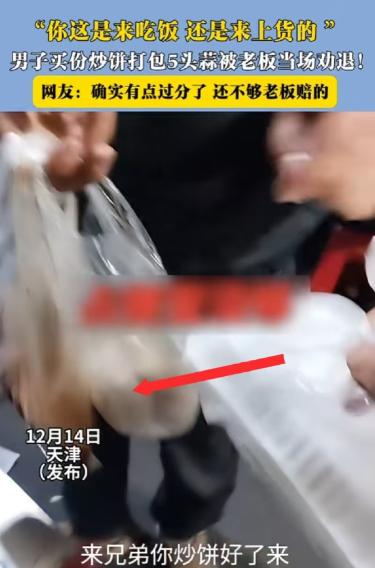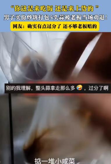 “这吃相也太难看了!”天津,一男子进店要了份打包的炒饼,可等老板做好准备给他时,却发现男子早已打包好五头蒜和不少咸菜,老板看后也是气不打一处来,当场对男子说:你走吧,我不卖给你了! 天津街角的“强子快餐”,主打12元一份的炒饼,实惠管饱,桌台上还摆着生蒜、自制咸菜和现熬辣椒油,供客人免费取用,附近不少人都爱来这儿吃晚饭。 老板强子为人爽快,只要客人按需拿取配料,他从来不多说一句。 事发那天傍晚七点半,晚餐的客流快过去了,店里还剩最后几位食客。 一名中年男子走进店里,冲后厨喊了一声:“老板,来一份炒饼,打包带走。” 强子应声答应,转身就忙着起火炒菜,手里的锅铲翻飞,很快就闻到了炒饼的香气。 可让强子没想到的是,男子没在门口乖乖等餐,反而径直走到了配料区。 等强子端着刚炒好的热乎炒饼出来,准备递给男子时,一眼就瞥见对方手里拎着三个鼓鼓囊囊的小塑料袋,看那样子是提前准备好的。 “哥们儿,你这拿的啥啊?”强子下意识地停住脚步,把炒饼放在柜台上,伸手接过了男子手里的塑料袋。 打开一看,强子的火气瞬间就上来了:第一个袋子里装着5头整蒜,个个饱满。 第二个袋子里是小半袋咸菜,都是他自己腌的;第三个袋子更离谱,竟然是满满一盒辣椒油,那是他当天下午刚熬好的。 “你买一份炒饼,拿这么多配料?”强子看着男子,语气里满是不解。 男子却觉得理所当然,坚持说:“我买炒饼,拿点配料下饭怎么了?” 强子指着塑料袋反驳:“下饭拿一点就行,你这5头蒜够炒两盘菜了,咸菜拿小半袋,辣椒油整盒端走,后面来的客人吃啥?” 两人的争执没持续多久,强子直接跟男子算了一笔账:“我这一份炒饼本来就赚不了几个钱,你这5头蒜、一盒辣椒油,成本都快赶上我卖一份饼的利润了,我总不能做亏本买卖吧?” 说完,他把炒饼往柜台上一推:“这炒饼我不卖给你了,你把这些配料留下,走吧。” 男子没料到强子会这么坚决,脸上一阵红一阵白,嘴里嘟囔着“小气”,却没敢再拿那些塑料袋,也没带走那份炒饼,转身快步走出了店门。 旁边桌的几位食客看得真切,纷纷议论:“拿这么多确实过分了,人家小本生意不容易,哪能这么薅羊毛?” 事后,强子越想越觉得这事离谱,就把店里的监控回放剪了一段发到网上。 视频里,男子动作麻利地往提前准备好的塑料袋里装配料,全程不到两分钟,网友们看了之后也吵开了锅。 有人觉得男子做得不对,“吃相太难看”,支持强子的决定;也有人觉得强子没必要这么较真,不就是几头蒜和点咸菜吗?犯不着把人赶出去。 还有不少网友分享了类似的经历,说自己家附近的餐馆也遇到过这种过度拿取免费配料的顾客,最后老板没办法,要么取消了免费服务,要么就设置了取用限额。 强子后来也没多想,只是在配料桌旁贴了一张手写提示,写明“每人限取1头蒜、2勺咸菜、3勺辣椒油,打包需付费”,又把辣椒油和咸菜换成了按压式分装瓶。 之后来店里吃饭的客人,都很自觉地按提示取用配料,再也没出现过一次性拿一大堆的情况。 其实这事说起来也简单,商家提供免费配料,是想让客人吃得舒心,是一份心意。 客人享受这份便利的同时,也得有分寸,不能把商家的善意当成理所当然。 一份炒饼的钱不多,几样配料的价值也有限,但做人的分寸不能丢,互相体谅一下,也就不会有这样的纠纷了。 如果各位看官老爷们已经选择阅读了此文,麻烦您点一下关注,既方便您进行讨论和分享,又能带来不一样的参与感,感谢各位看官老爷们的支持!