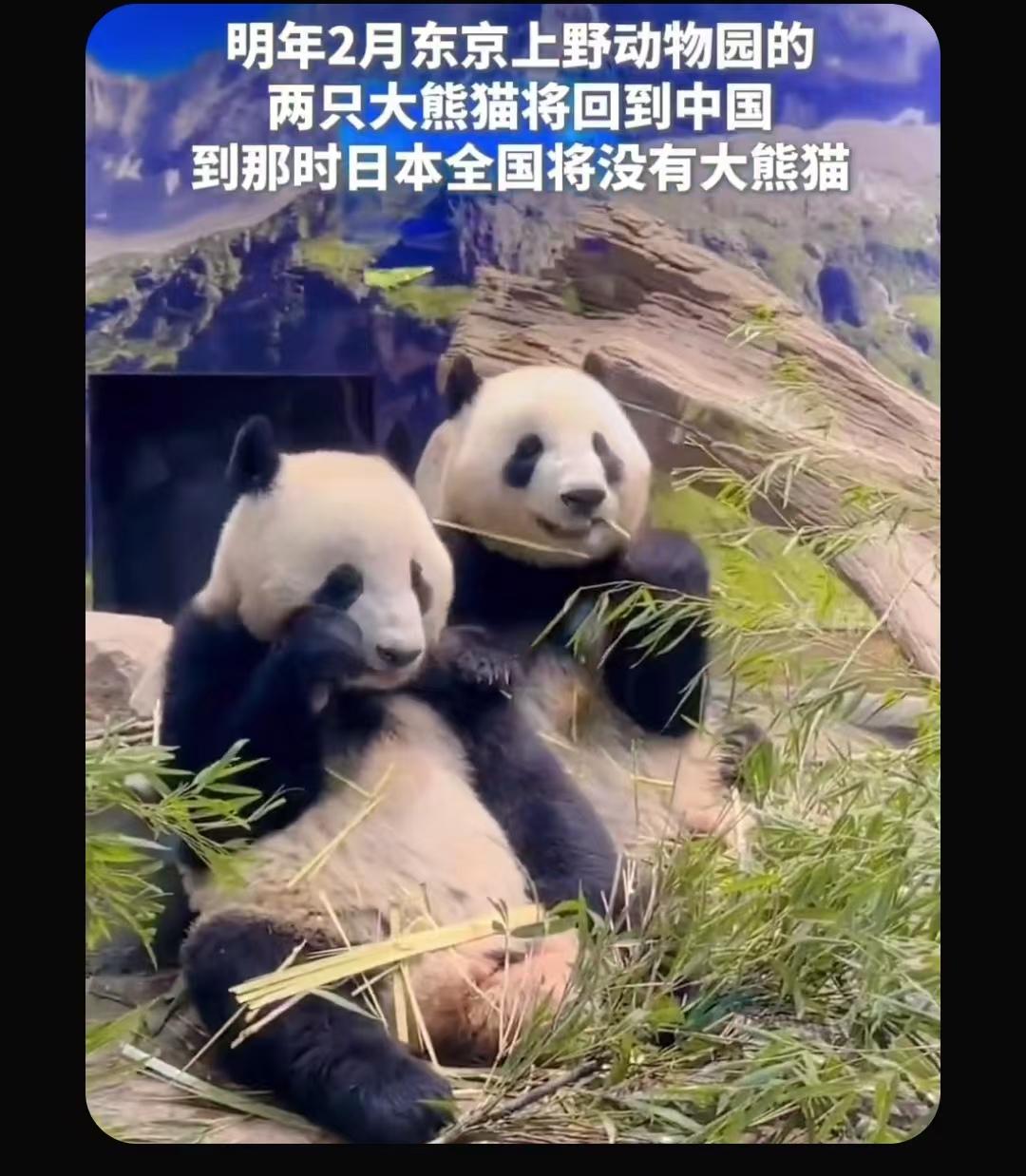 日本马上没有大熊猫了 看看我们的国宝晓晓和蕾蕾。租借给日本的时间很快到来了!我们这两个国宝可能即将在明年2月份回归中国。 由于当前中日紧张关系,续租前景迷茫! 前几天我看到有些网友说赶紧把大熊猫接回来吧,希望以后不再租借给日本。 一直以来,大熊猫作为中日友谊的特殊使者,在日本也很受欢迎。但如今由于中日关系紧张,以及日本领导人在台海问题上的挑衅,大放厥词。还拒不收回错误的言论。使得中日关系未来走向有太多的不确定性。所以续租问题充满变数。 可如今,因两国关系紧张,这两只可爱的大熊猫可能要告别日本。明年2月,这个时间节点让无数熊猫粉揪着心! 网友们!你们说还应不应该租借熊猫给日本呢?欢迎评论区留言讨论。
