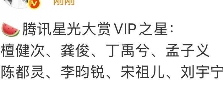 🍉🐧星光大赏VIP之星🌟檀健次 龚俊 丁禹兮 孟子义陈都灵 李昀锐 宋祖儿 刘宇宁(排名不分先后)还有瓜主说赵露思有别的奖项 VIP之星男女比例没协调啊可信不