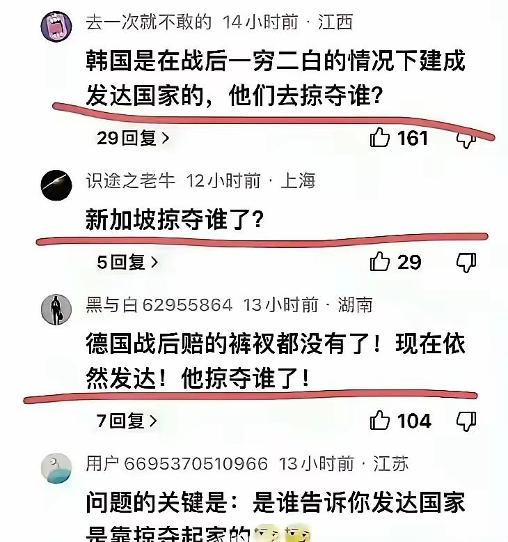 1、韩国掠夺谁了?掠夺越南。在美国对越南的战争中,韩国累计出兵30万,是出兵最多的美国盟国。 2、德国掠夺谁了?德国战前掠夺全欧,至于战败赔款,只要曾经巨富过,再起是容易的。比如说,如果你有能力欠债一千亿还不被弄死,那你的日子就会很滋润。对了,美国为欧洲战后重建提供资金的马歇尔计划中,德国获得的资金比英法加起来还多。 3、新加坡掠夺马来西亚、印尼。新加坡从马来西亚独立出来可不是自己想独立的,相反新加坡一心想留在马来西亚,是马来西亚把新加坡踢出去的。为什么马来西亚要主动丢弃领土?