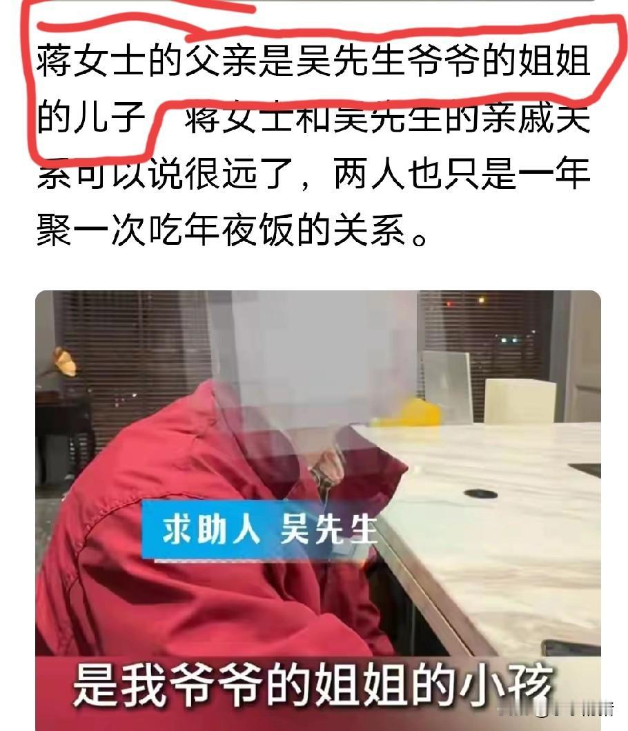 蒋女士的父亲是吴先生爷爷的姐姐的儿子。这是什么关系?我想了很久都没搞懂蒋女士和吴先生到底是什么关系?我问了两个人都没捋清他们到底是什么亲戚关系!看这个新闻,蒋女士是独身,没有其他亲戚,这个吴先生想继承她的遗产,好像是法律上不允许!